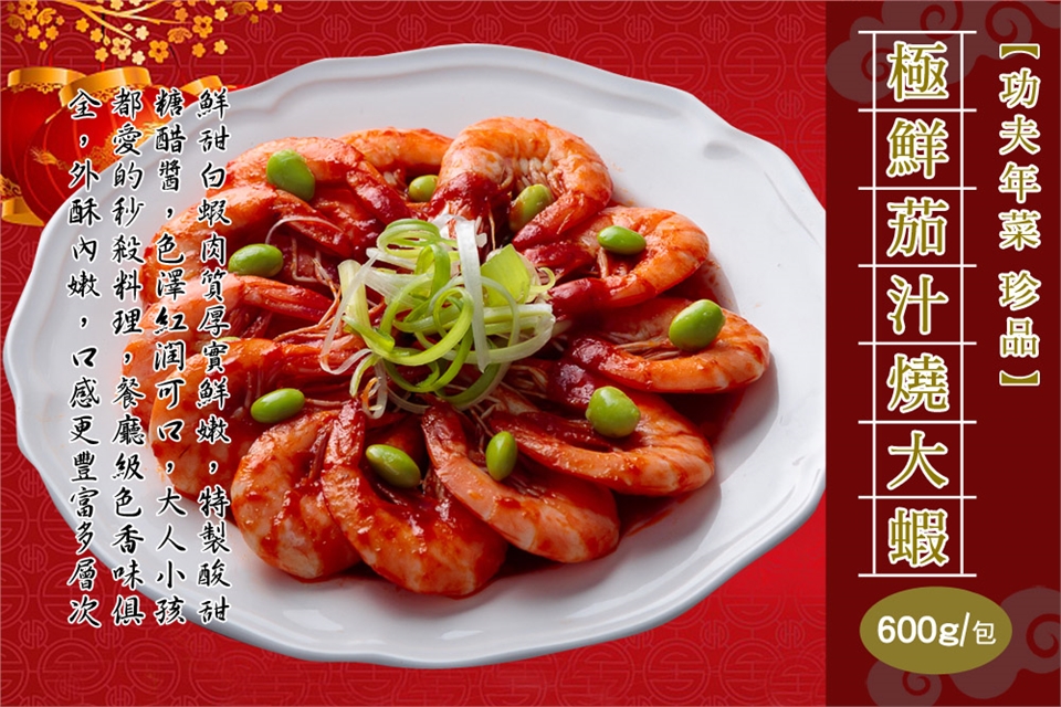 6.極鮮茄汁燒大蝦(600g/包;固型物220g)- 水、白蝦、番茄醬(水、蕃茄糊、蔗糖、釀造醋、食鹽、香辛料(白胡椒、肉桂、紅辣椒、薑、丁香、肉豆蔻、芥末、月桂葉、眾香子))、糖、澱粉(乙醯化己二酸二澱粉)、洋蔥、蒜頭、青豆仁、白醋(水、米、食用酒精、果糖)、烏醋(水、釀造酢、糖、鹽、洋蔥、濃縮柳橙汁、番茄糊、胡蘿蔔汁濃縮汁、大茴、小茴、芹菜籽、焦糖色素(第一類)、香料、鹽、味鮮(L-麩酸鈉、胺基乙酸、琥珀酸二鈉、岩鹽、5'-次黃嘌呤核苷磷酸二鈉、5'-鳥嘌呤核苷磷酸二鈉)。