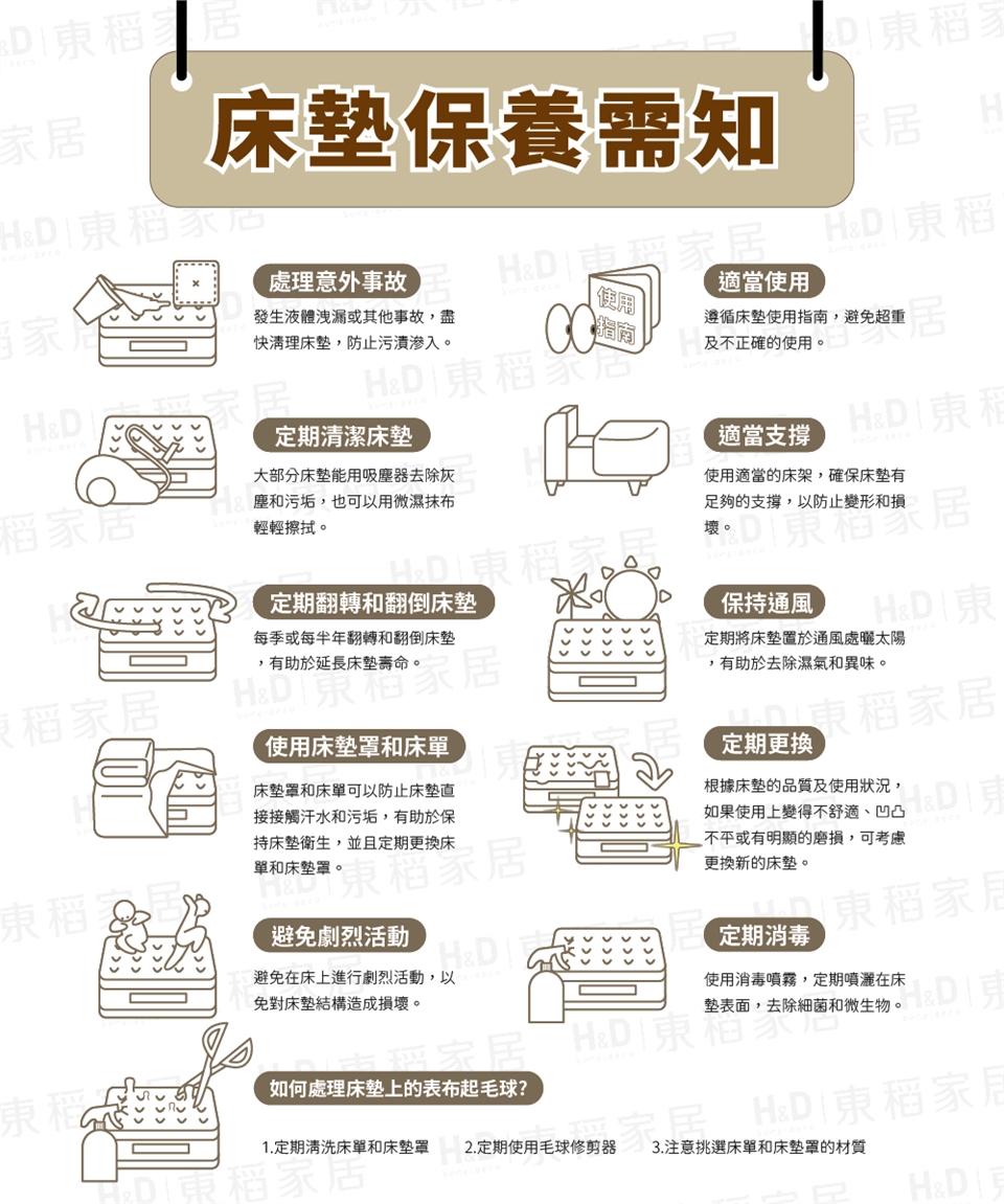 平時應套上床包或是保潔墊,避免髒汙滲透於床墊內。
