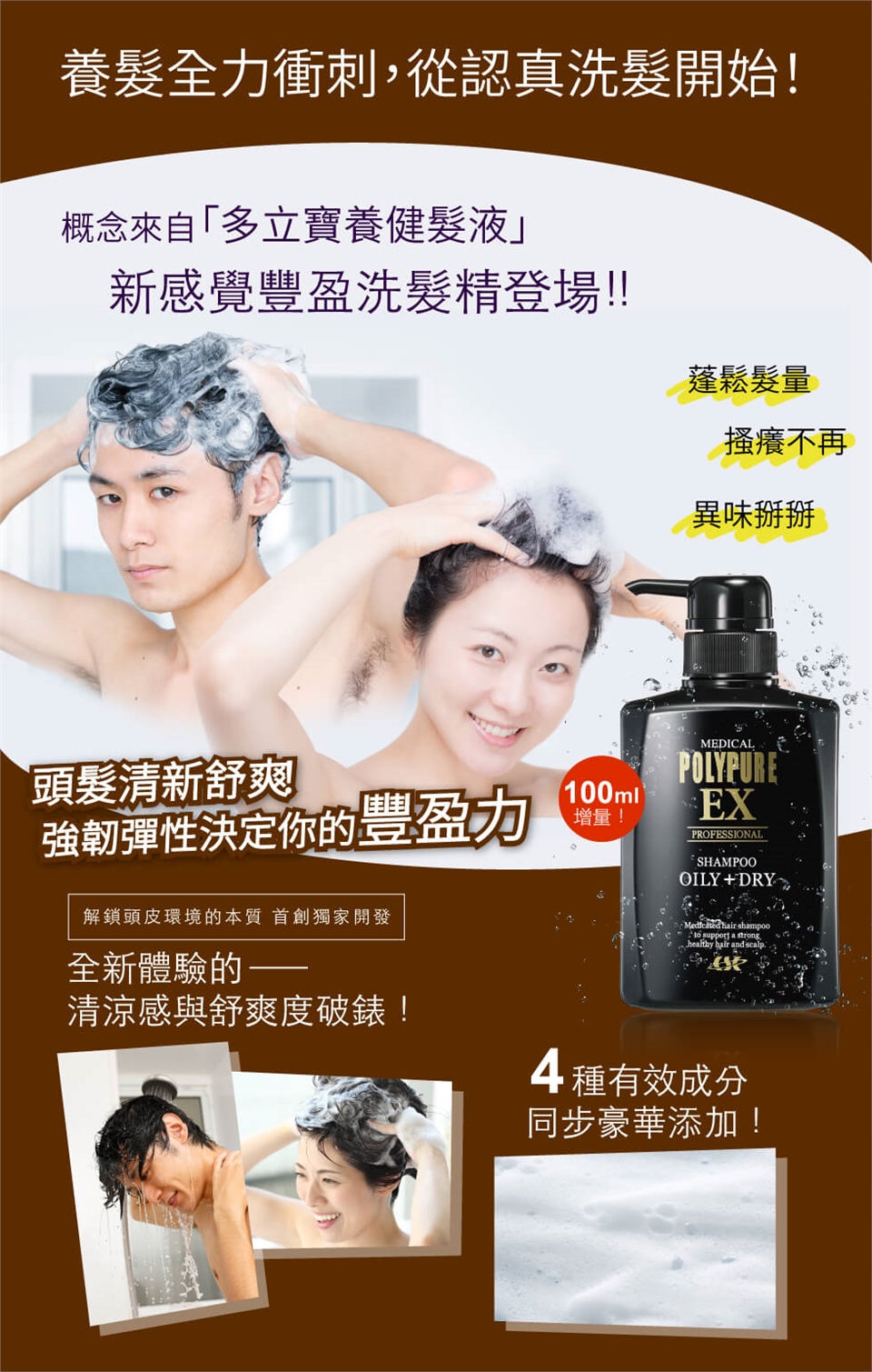 以雙手取適量,加入清水起泡後塗抹於頭皮及髮絲,並於頭皮加強按摩,最後以清水洗淨。