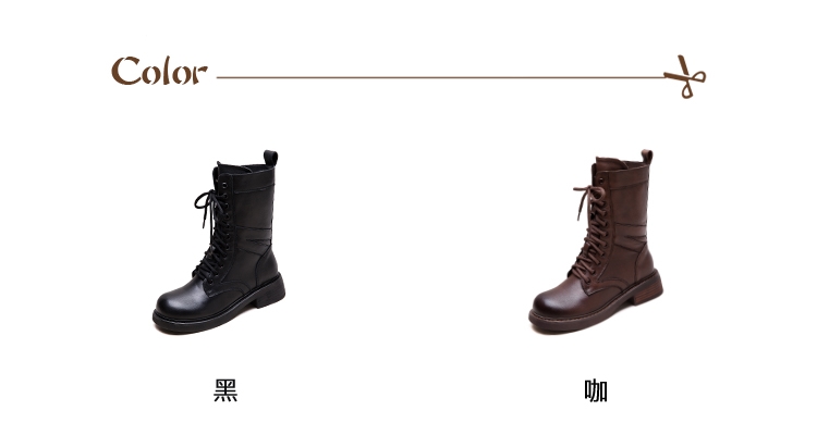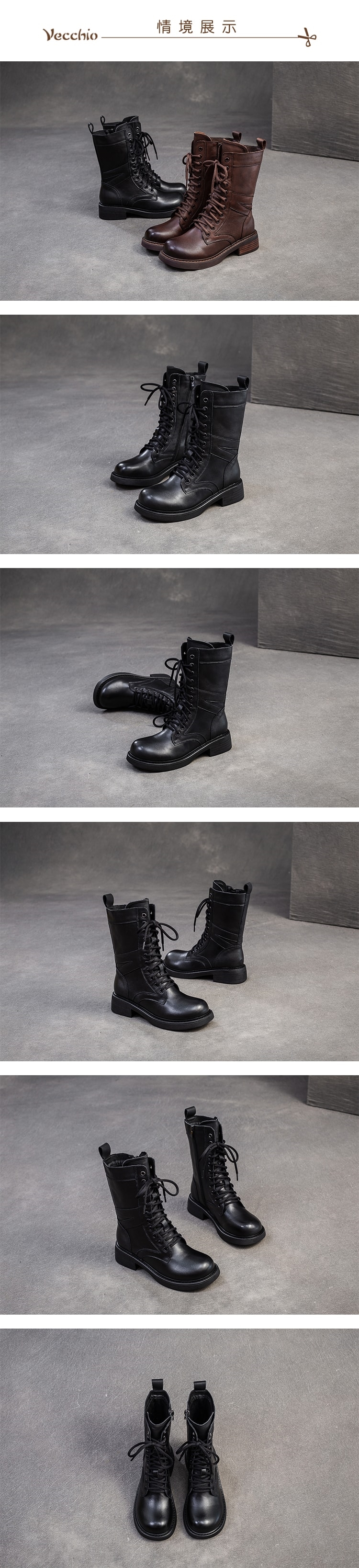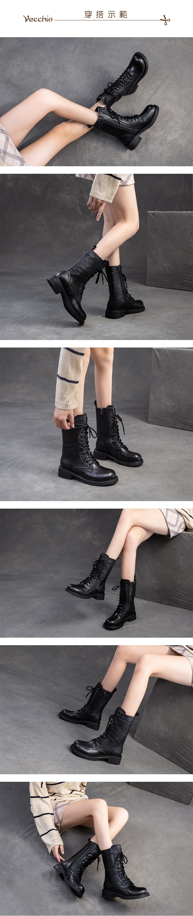 【VECCHIO】真皮拼接繫帶中筒馬丁靴/真皮頭層牛皮潮流拼接繫帶個性中筒馬丁靴 女鞋 黑