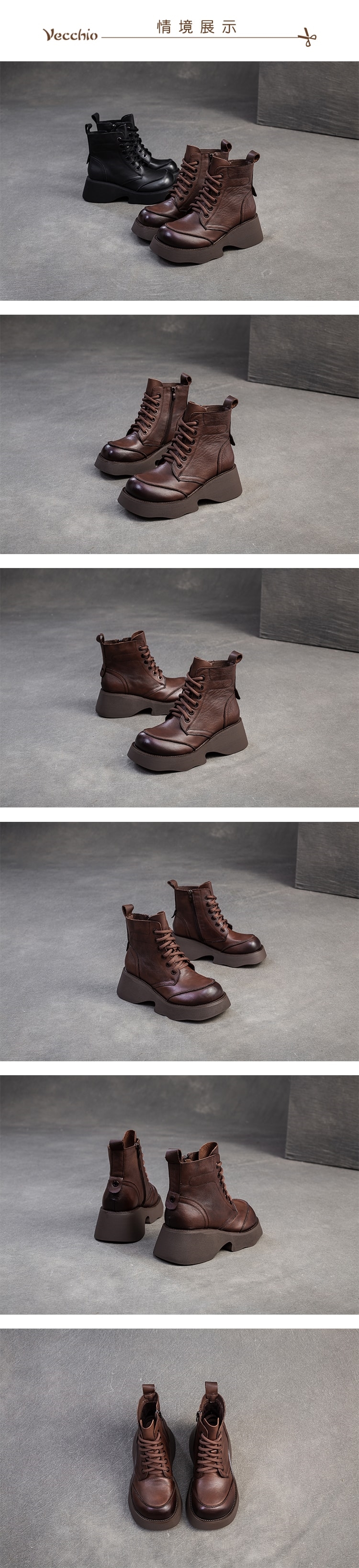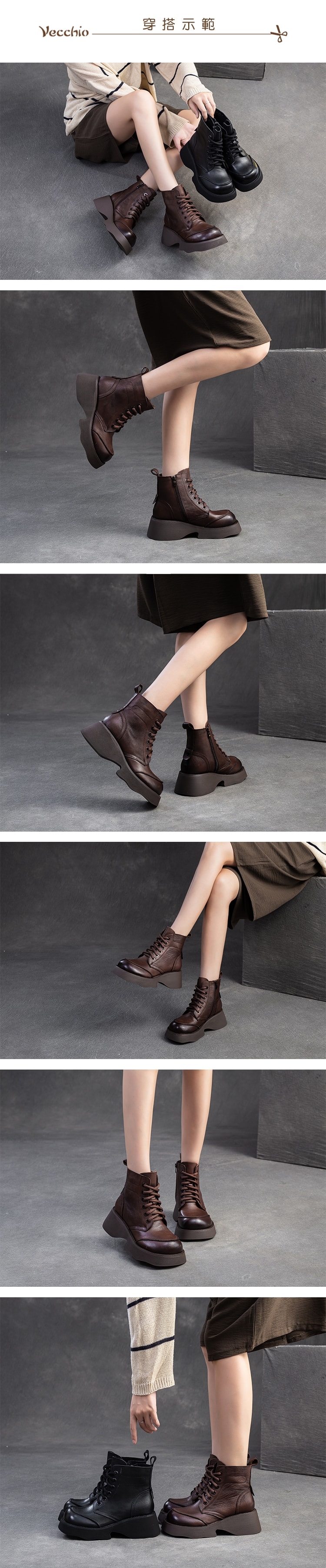 【VECCHIO】真皮拼接坡跟厚底短靴/真皮頭層牛皮典雅車線拼接坡跟厚底短靴 女鞋 咖