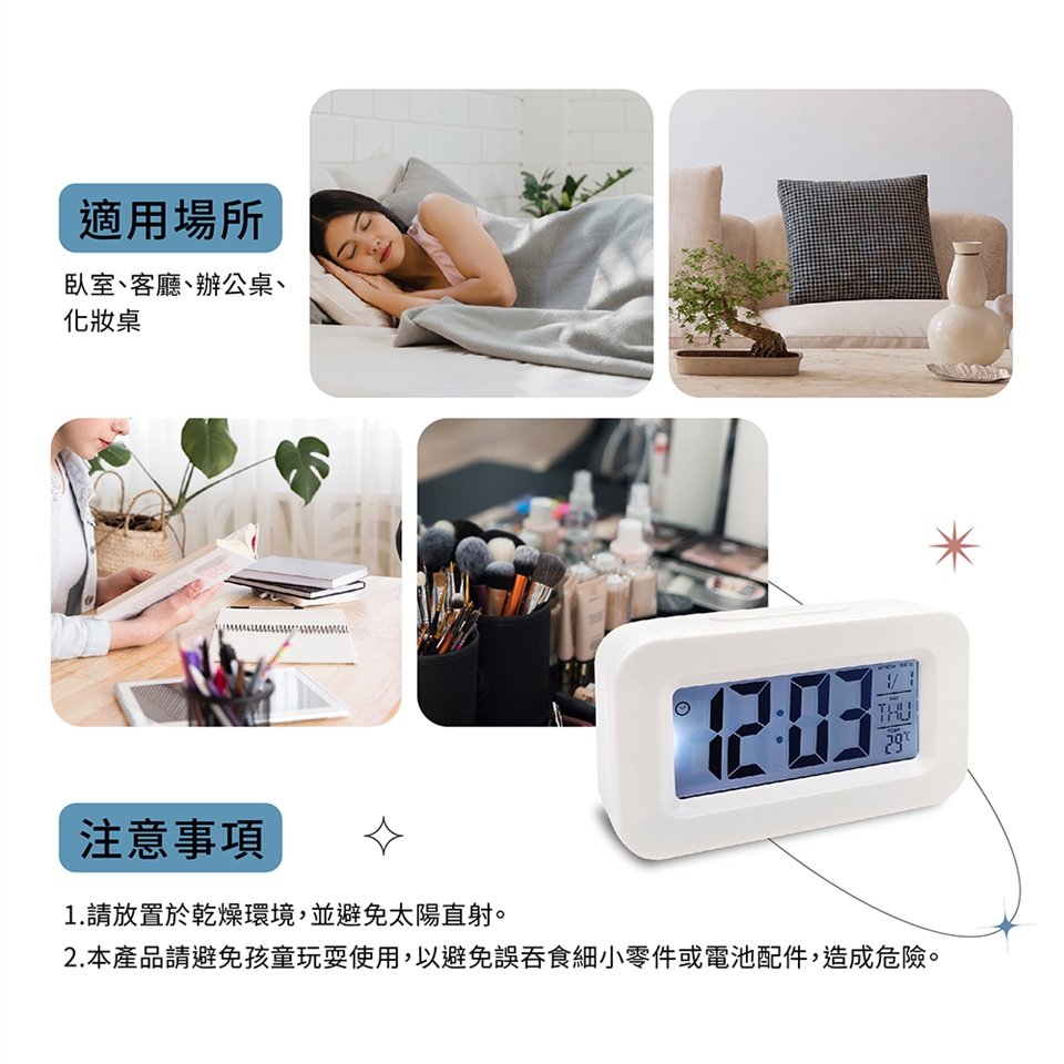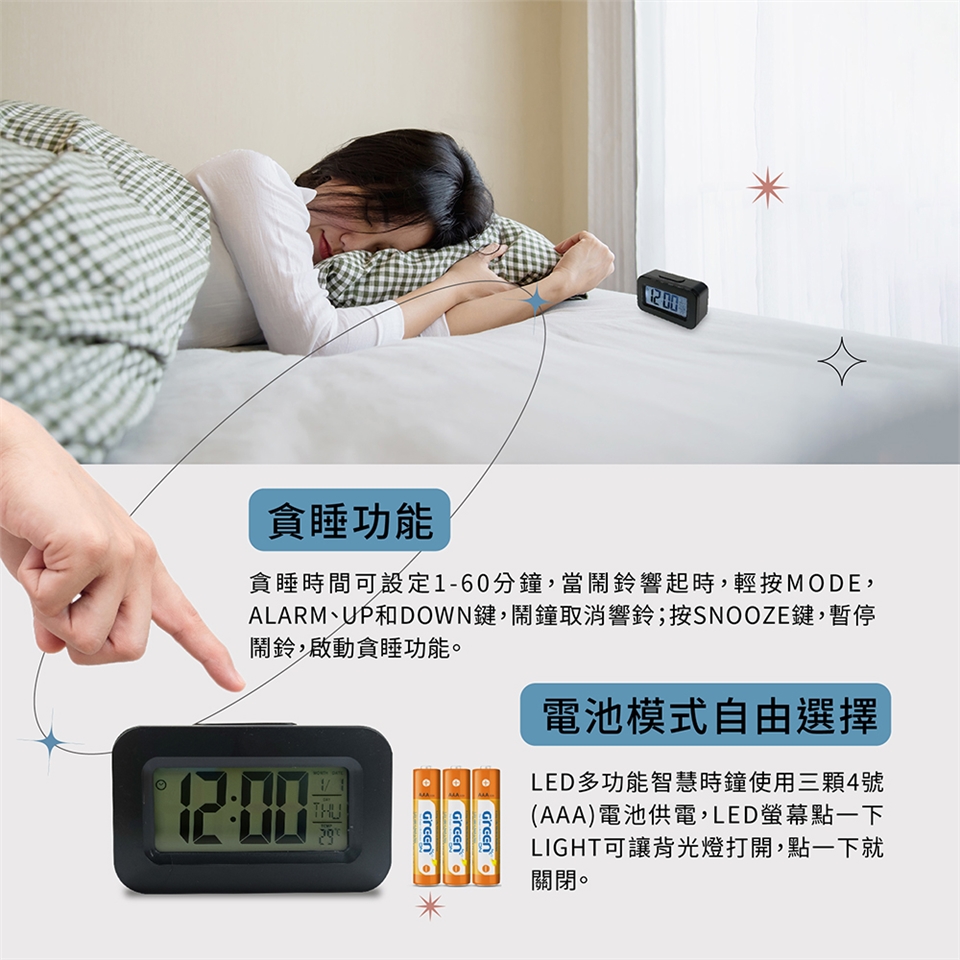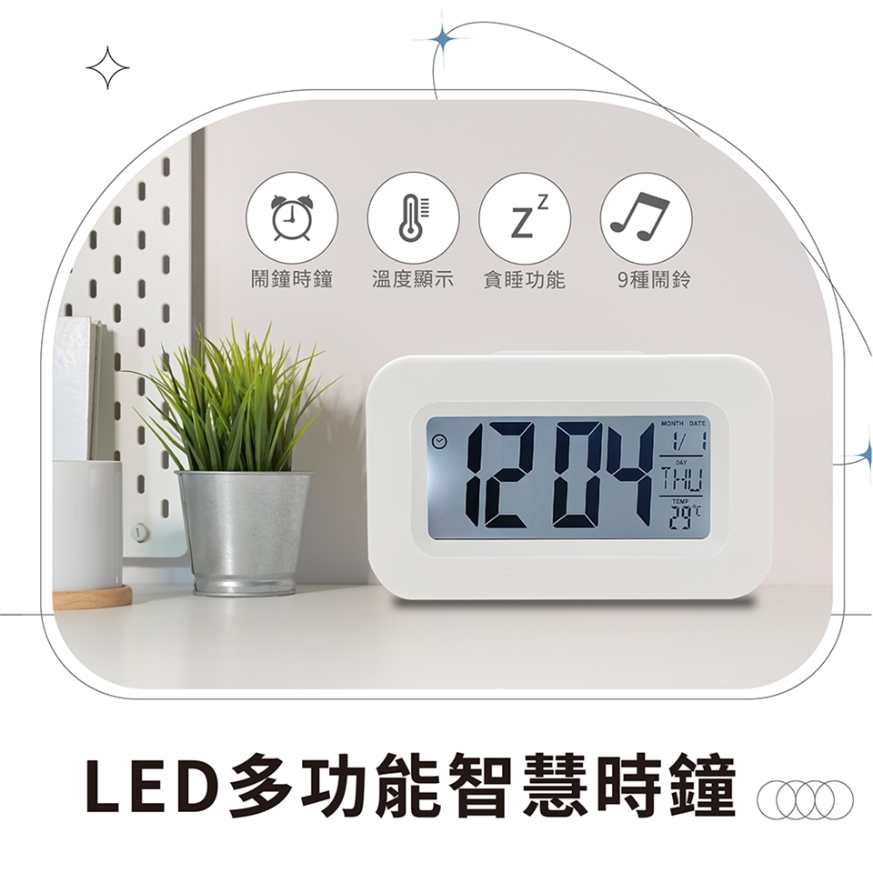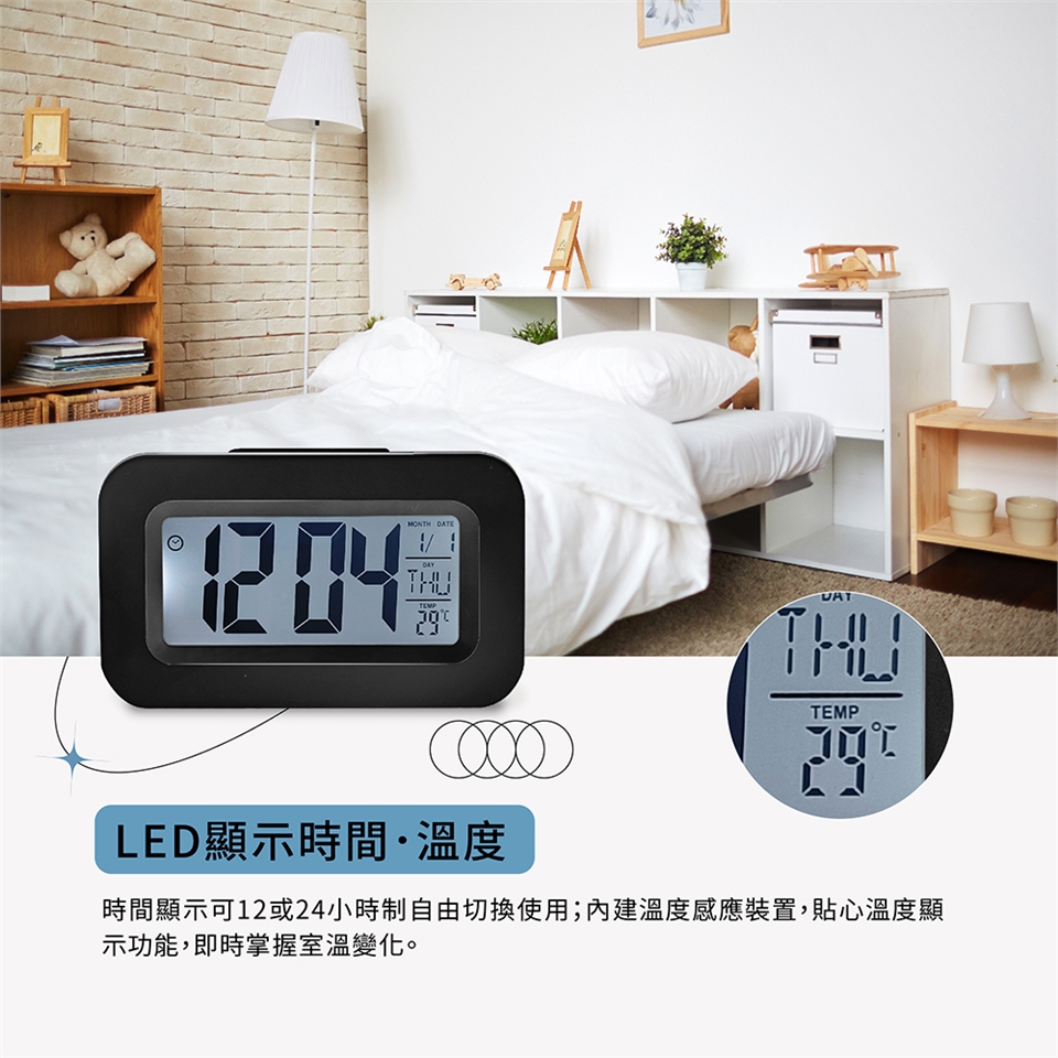 LED多功能智慧時鐘,時間顯示可12或24小時制自由切換使用;內建溫度感應裝置,貼心溫度顯示功能,即時掌握室溫變化