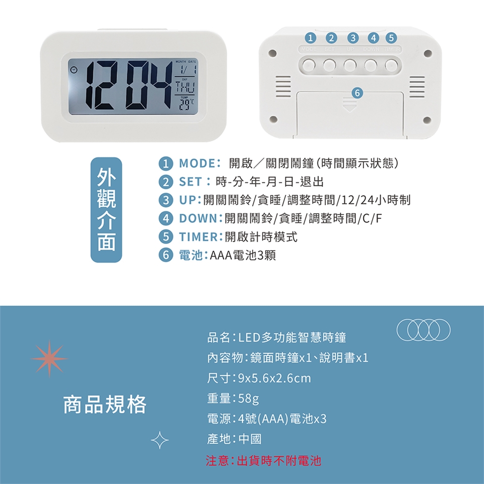 LED多功能智慧時鐘使用三顆4號(AAA)電池供電,LED螢幕點一下LIGHT可讓背光燈打開,點一下就關閉