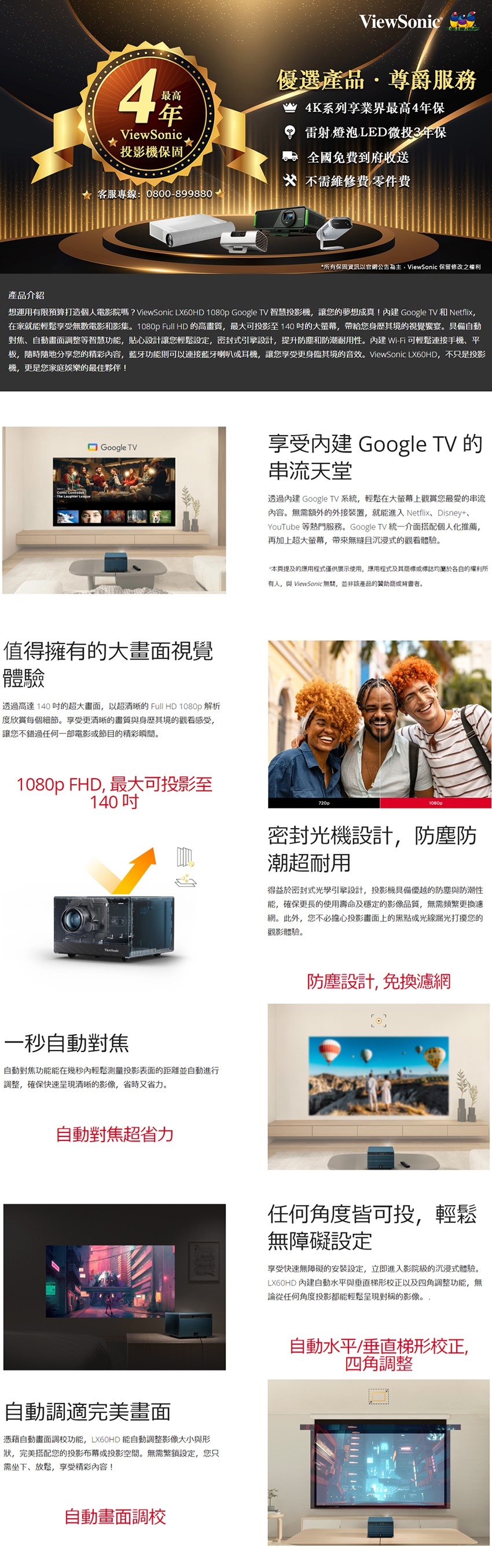 ViewSonic 優派 LX60HD 1080p Google TV 智慧投影機(630ANSI/側投/自動對焦/智慧避障)