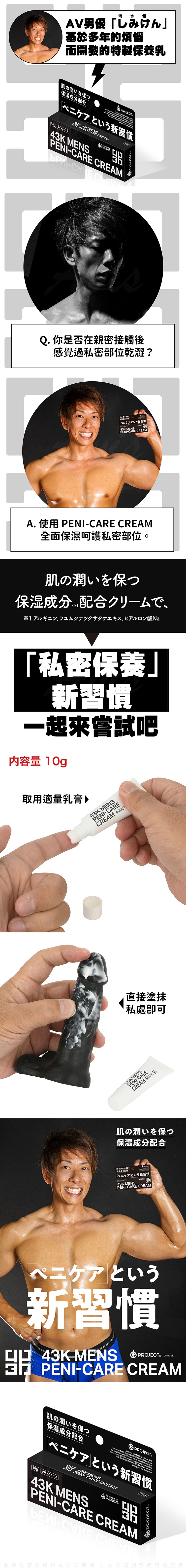 日本 G PROJECT 推出的 43K Peni-Care 男性私密處保養乳液,專為男性私密部位設計。由知名 AV 男優 清水健因應多年的肌膚保養需求,特別研發出的專屬乳液。此款乳液帶來全新的「私密保養」概念,適合重視日常清潔與舒適感的男性。