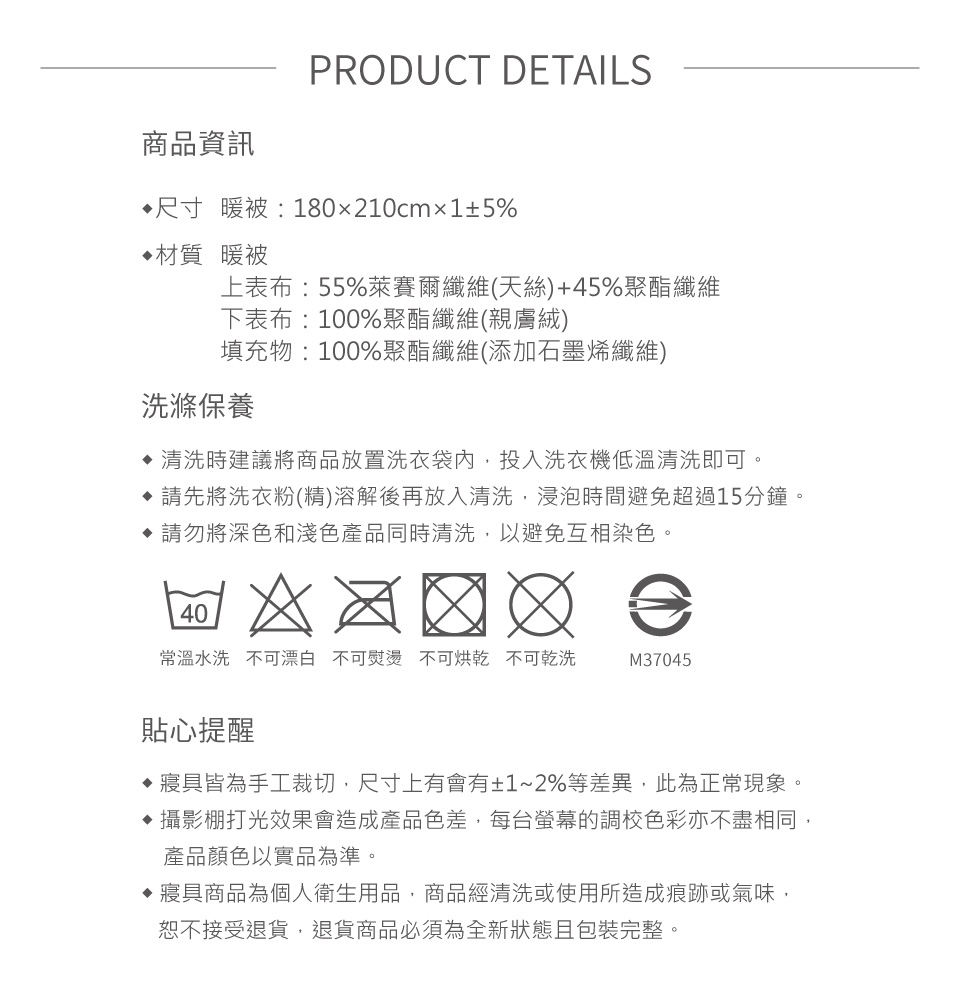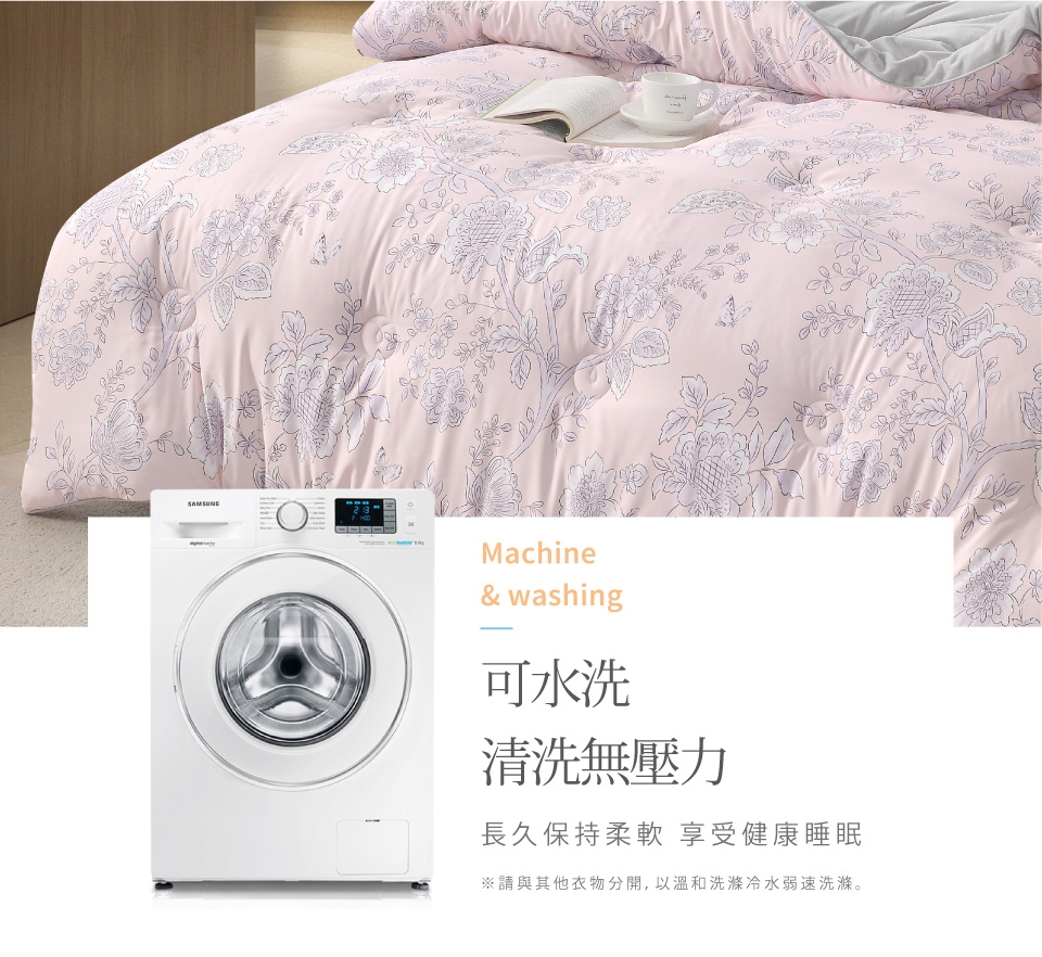 .清潔保養方式-可水洗/不可烘乾/不可漂白/勿使用強力漂白清潔劑/浸泡時間請勿超過20分鐘/建議可放入大型洗衣袋後再清洗(因深色布料請勿使用含漂白劑之洗劑,盡量避免浸泡,深淺色寢具請分開清洗)