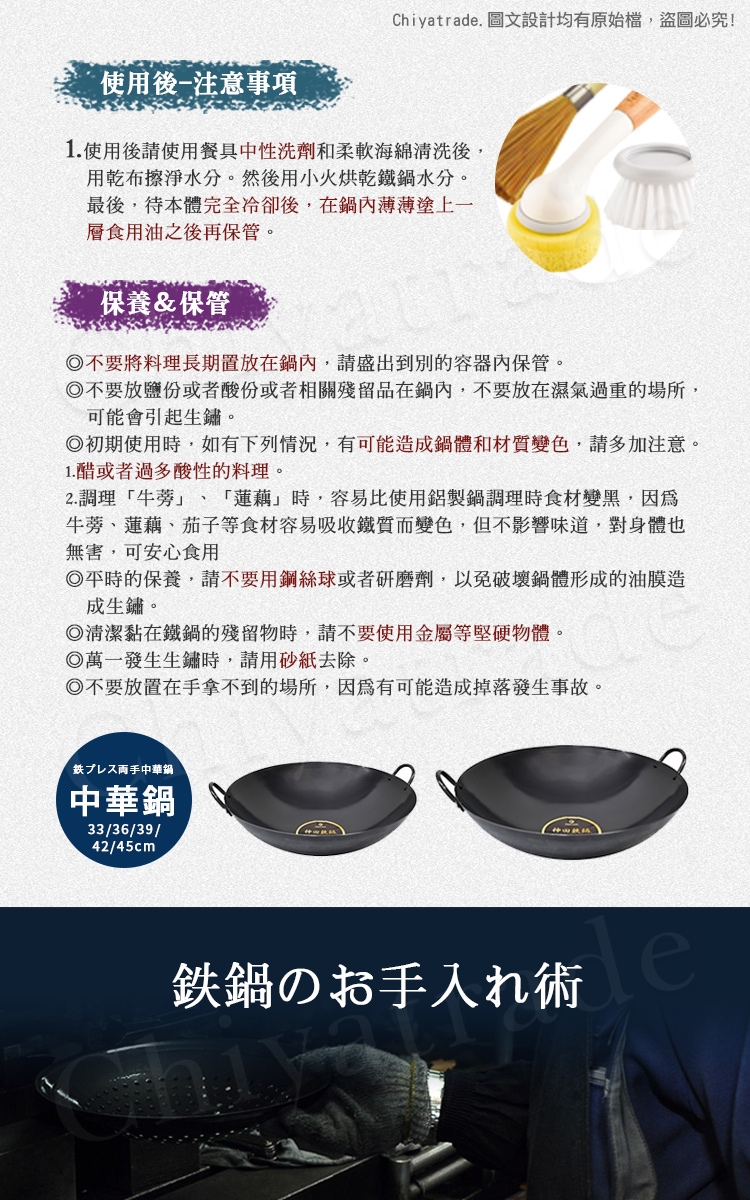 ●使用後請使用餐具中性洗劑和柔軟海綿清洗後,用乾布擦淨水分。然後用小火烘乾鐵鍋水分。