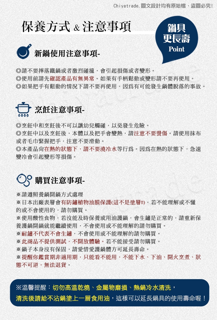 ◎本產品是純鐵製產品,不要將料理長期置放在鍋內,請盛出到別的容器內保管。