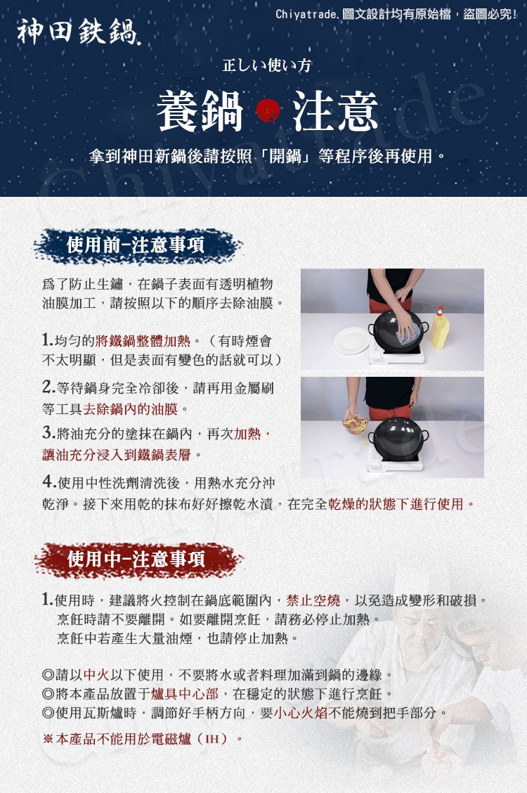 ◎平時的保養,請不要用鋼絲球或者研磨劑,以免破壞鍋體形成的油膜造成生鏽。