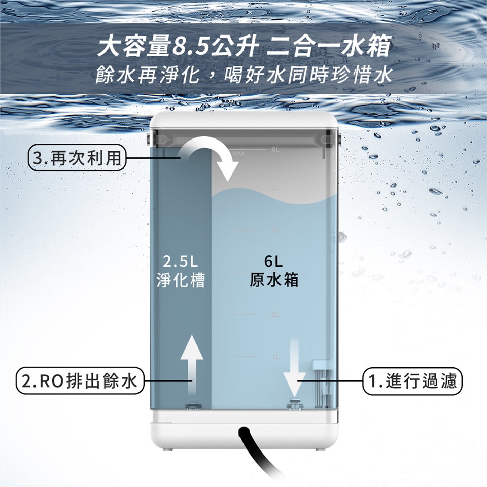 水箱容量:原水箱6L/淨化槽2.5L/總容量8.5L
