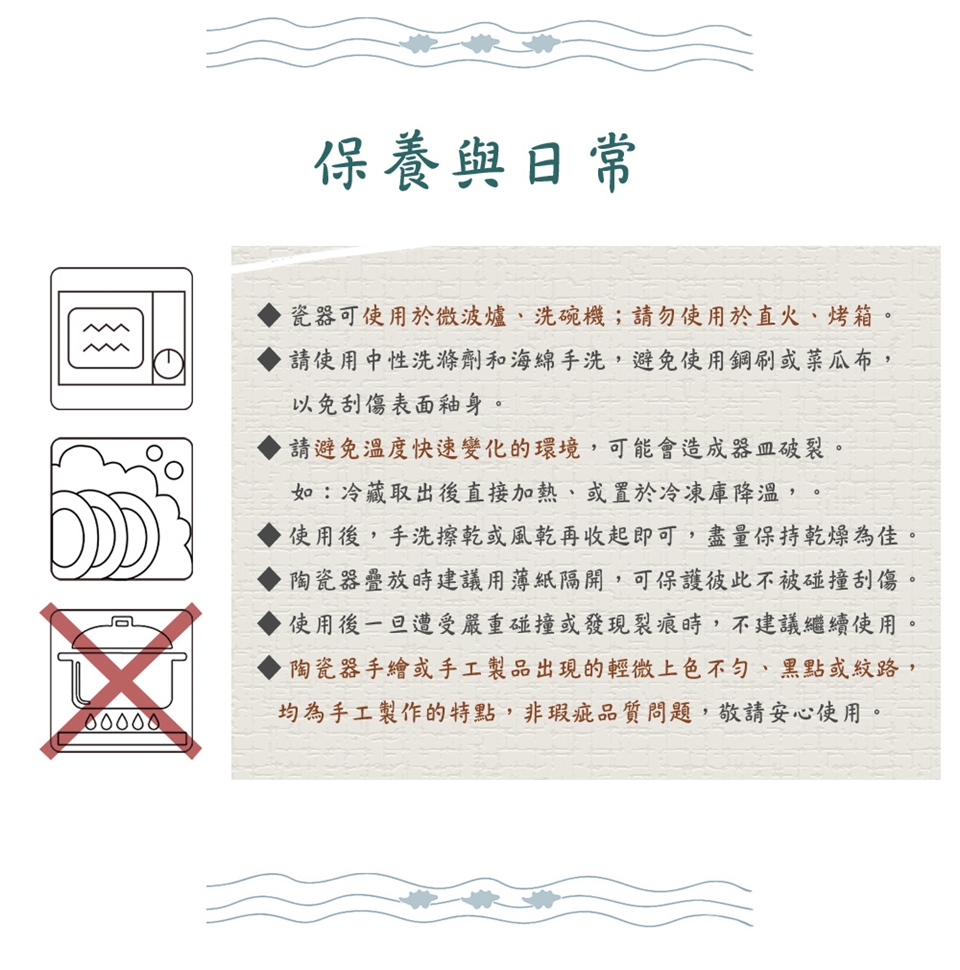 ■ 陶瓷器手繪或手工製品出現輕微的上色不勻、黑點或小紋路,