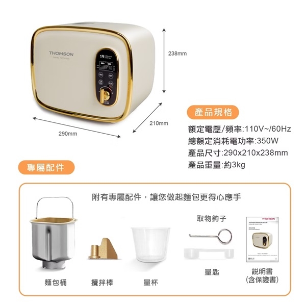 配件: 麵包桶(含攪拌棒)*1、量杯*1、量匙*1、取物鉤子*1、說明書(含保證書)*1