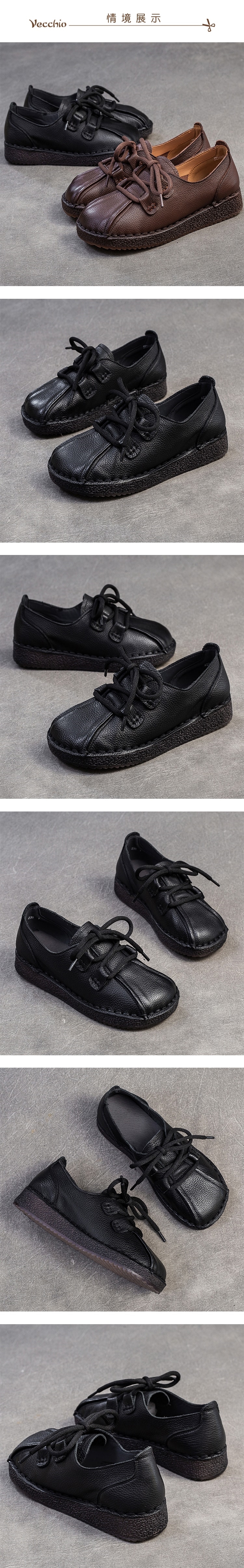 【VECCHIO】真皮軟面繫帶平底休閒鞋/真皮頭層牛皮復古軟面繫帶平底休閒鞋 女鞋 黑