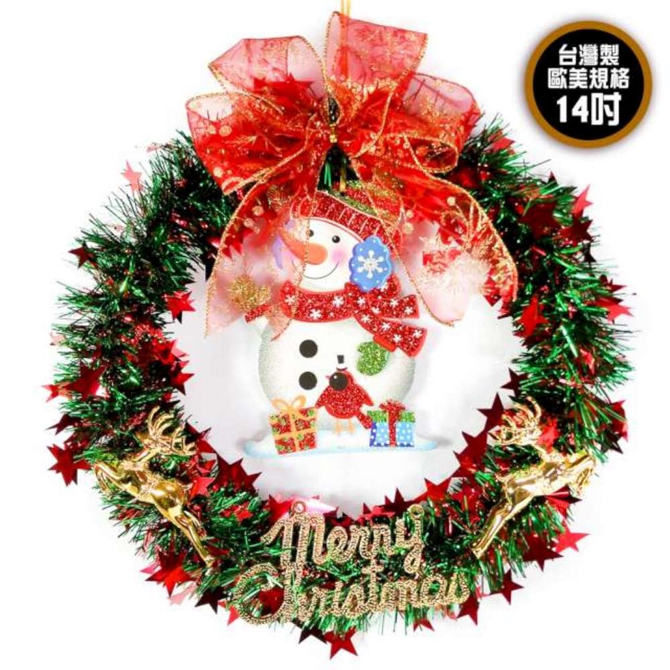 YS-MTW14010 14吋紅綠金蔥聖誕星星花圈-可愛雪人款