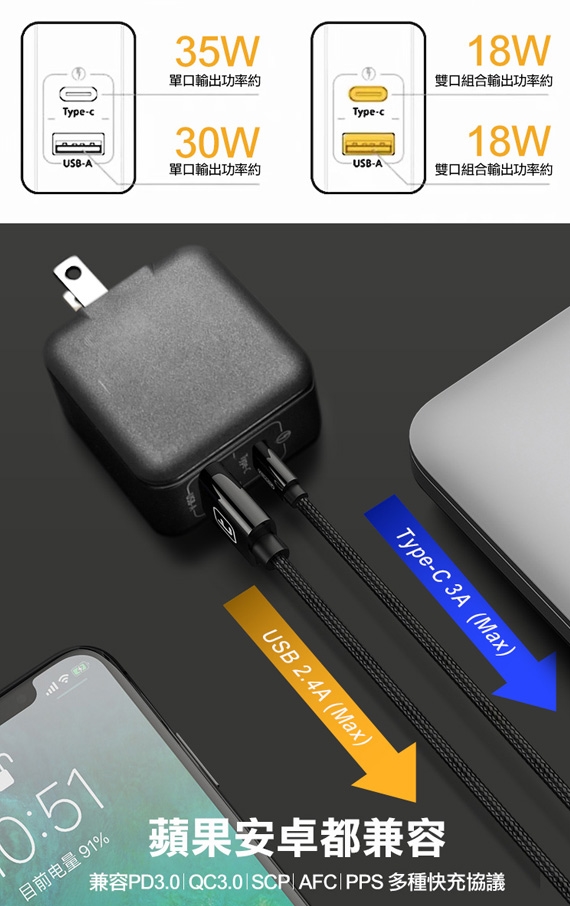 輸出電壓:Type-C:5V=3A,9V=3A,10V=2.25A 35WMaxUSB:5V=3A30WMax