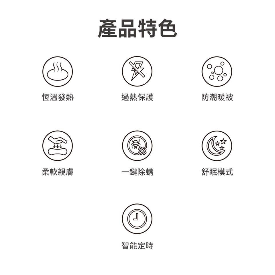 透過雙螺旋發熱絲,實現高溫斷電保護,電熱毯超溫時自動切斷電源。