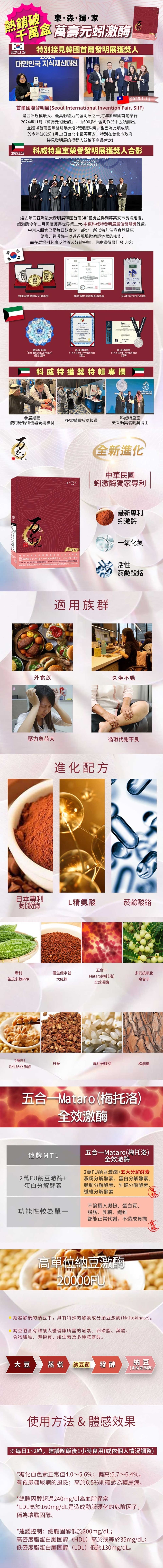 商品詳細介紹 體驗說明 萬壽元專利高濃度蚓激酶穩控強化配方膠囊(30粒/盒)*3(開放一盒體驗,退貨須歸還) 使用方法說明 每日1-2次,每次1粒,一日請勿超過2粒,多食無益。請搭配冷溫開水食用,飯前飯後皆可 注意事項 本品含大豆、牛奶及其製品