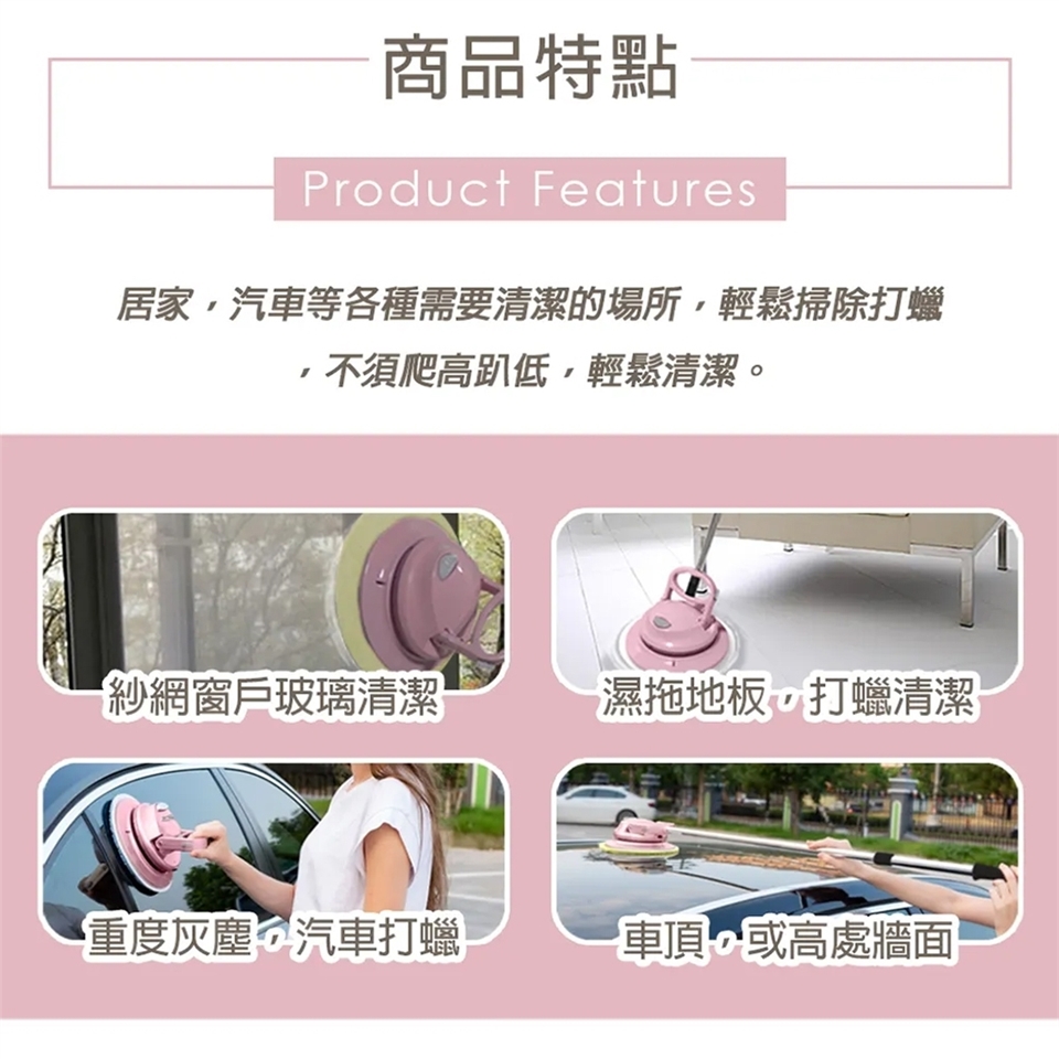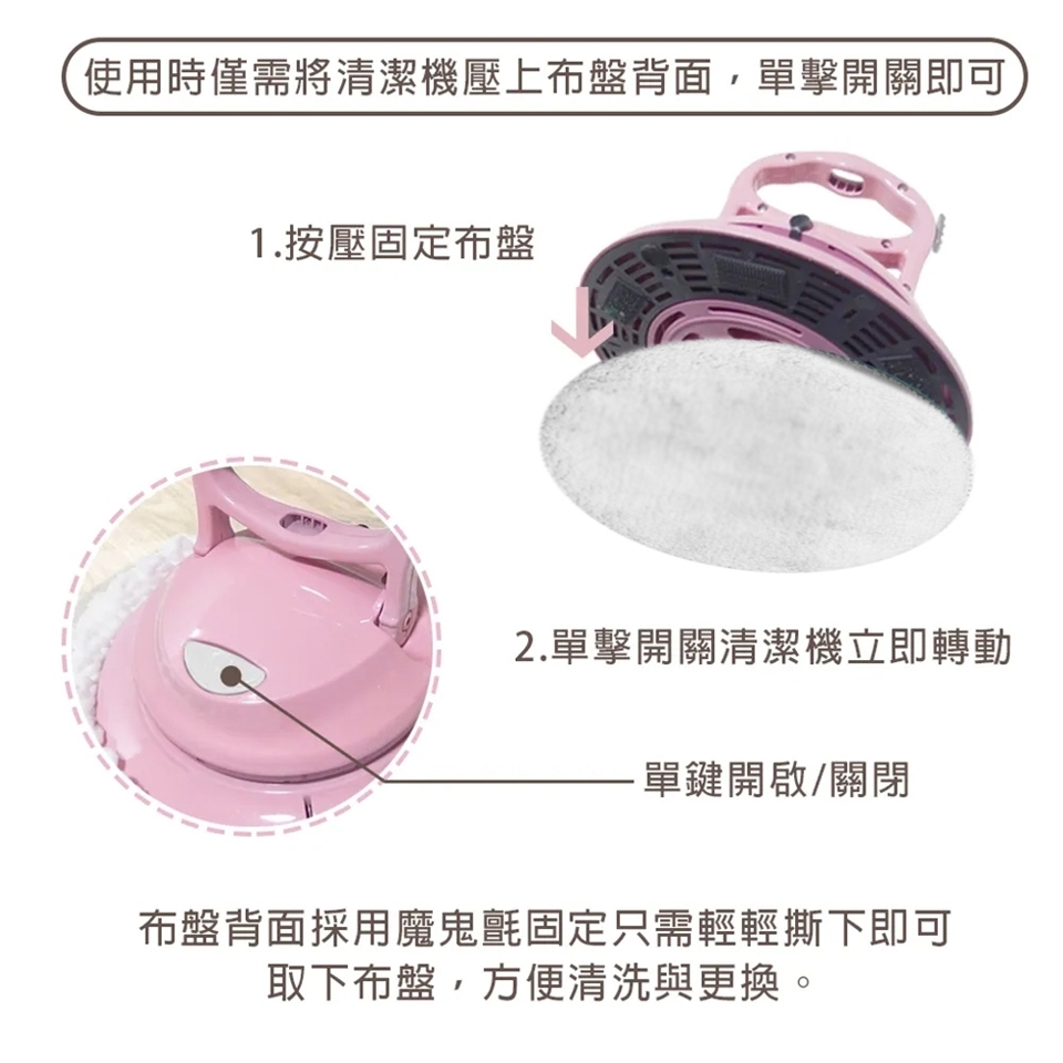 市售拋棄式清潔布可黏貼於本機旋轉頭,並使用在地板、玻璃、沙發、愛車等等做使用