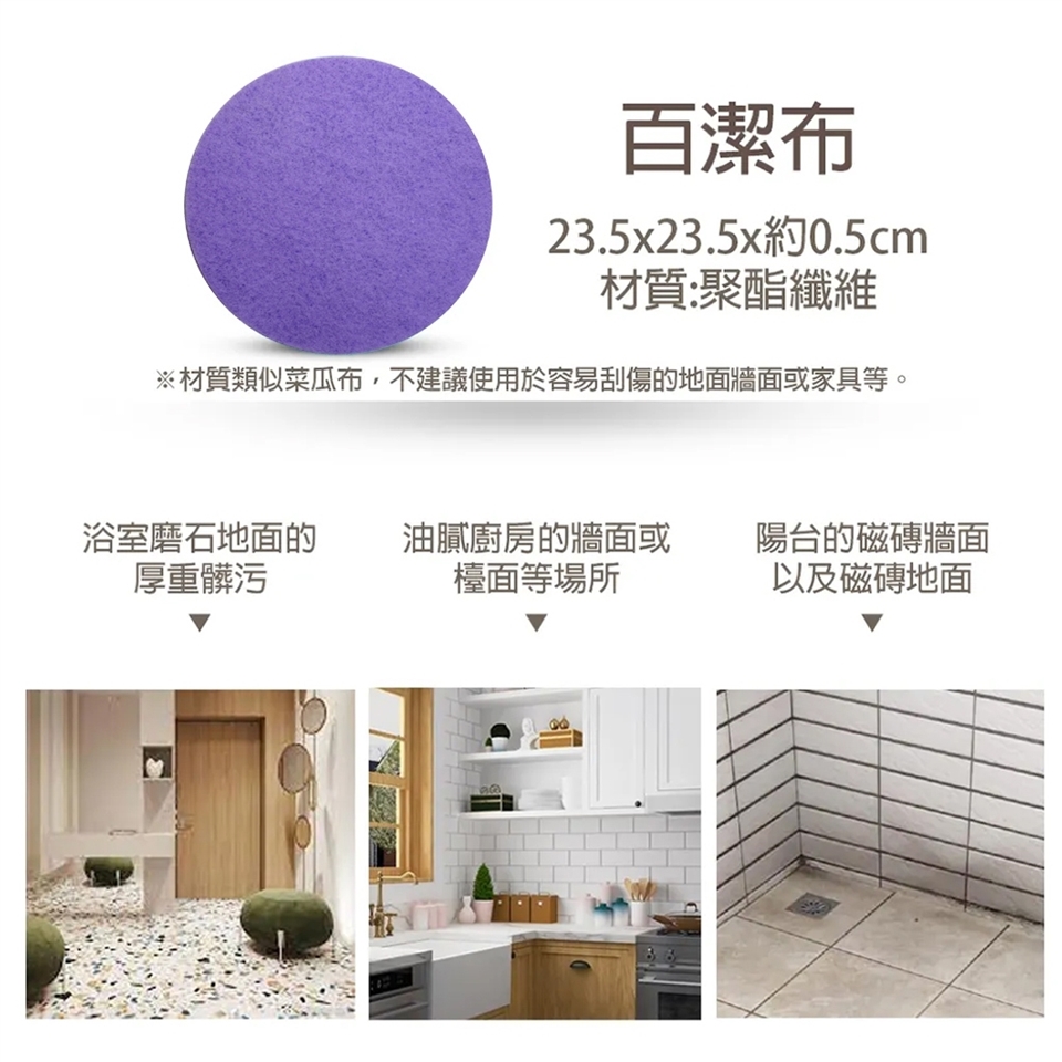 市售菜瓜布亦可粘黏貼於本機旋轉頭,並使用在紗窗、廚房磁磚、油汙污漬等較難以清潔之方面