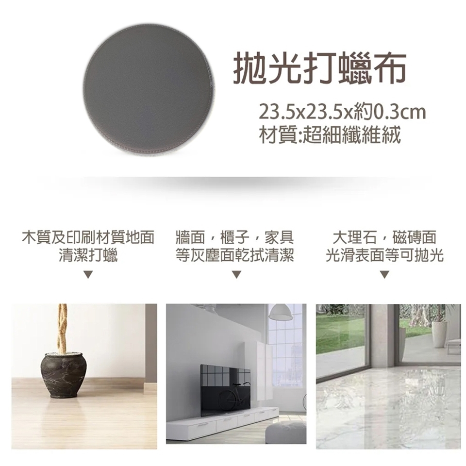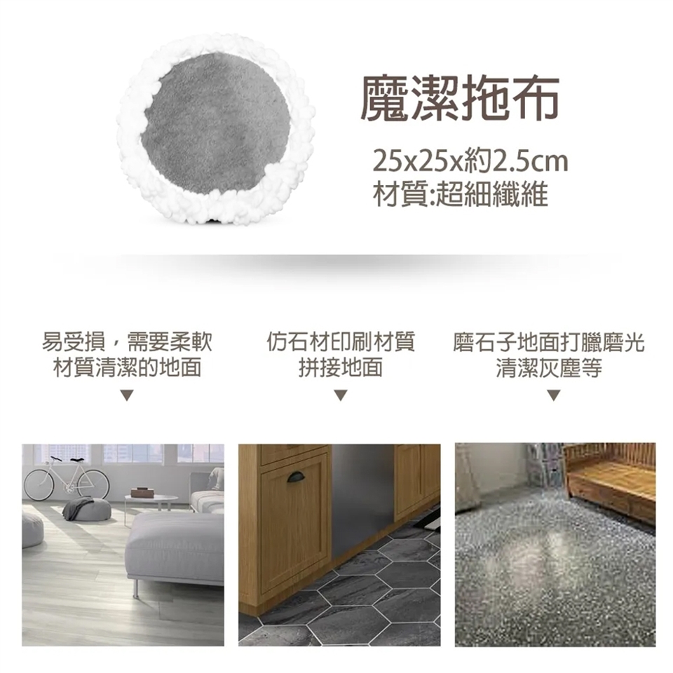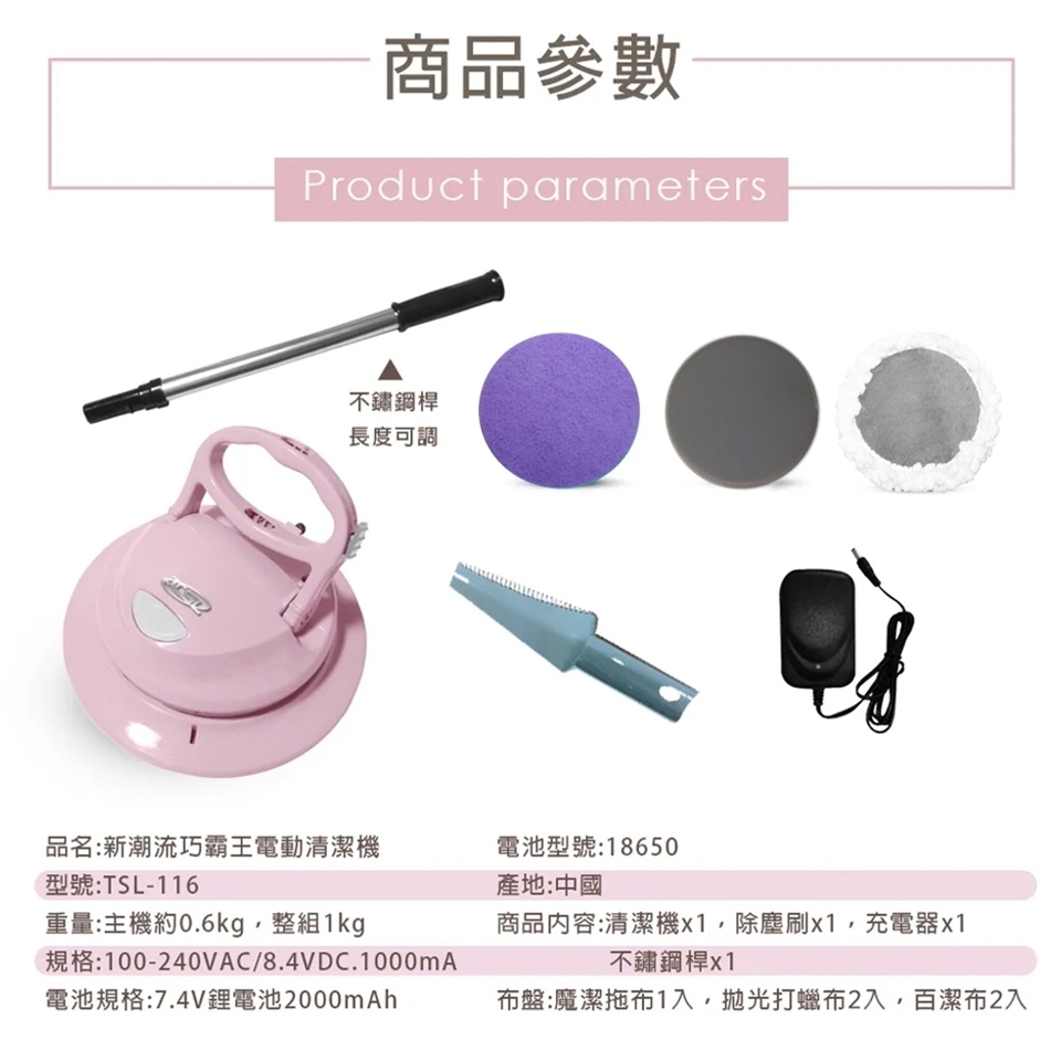 內容物 : 主機*1、說明保證書*1、充電器*1、伸縮鋁桿*1、拋光布*2、魔潔拖布*1、百潔布*2