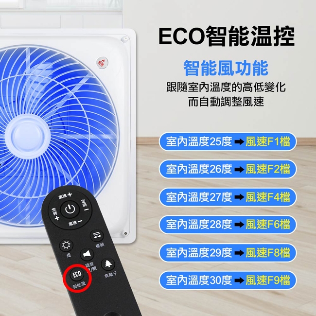 ◎ECO智能風:風速隨室溫自動調速,加倍省電