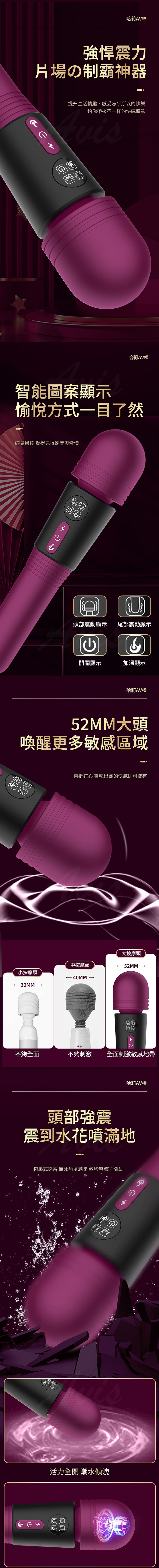 52mm巨型按摩頭,深入敏感區域,帶來全方位的酥麻刺激,點燃慾望之火。12種震動模式隨心切換,讓你從輕柔撫慰到強烈衝擊,層層疊加,直至敏感爆發。