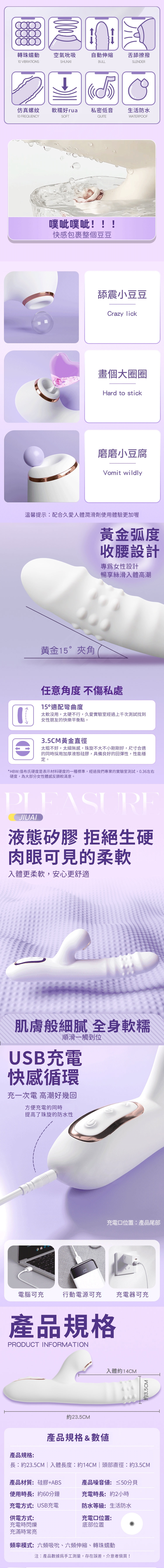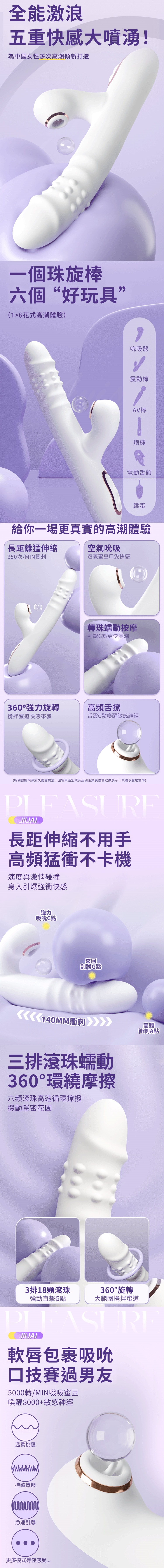 久愛珠旋棒,以雙頭設計搭配三排18顆滾珠的蠕動功能,提供前所未有的深入刺激。一端強力吸舔與6頻伸縮衝刺結合,另一端滾珠360°旋轉環繞,將觸感提升至極致,強勁直擊G點,帶來無可替代的愉悅感受。六種吸吮模式與伸縮轉珠的完美結合,徹底攪動隱密花園,喚醒每寸快感。