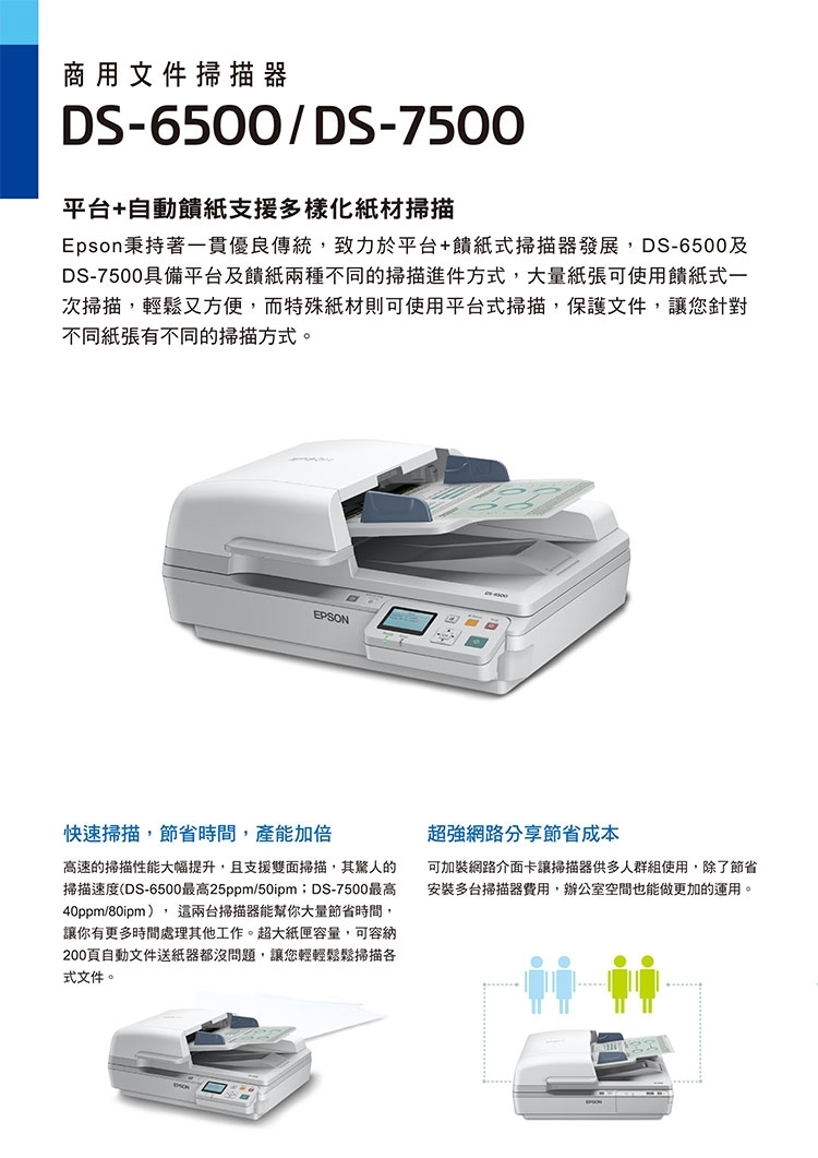 Epson秉持著一貫優良傳統,致力於平台+饋紙式掃描器發展,DS-7500具備平台及饋紙兩種不同的掃描進件方式,大量紙張可使用饋紙式一次掃描,輕鬆又方便,而特殊紙材則可使用平台是掃描,保護文件,讓您針對不同紙張有不同的掃描方式。