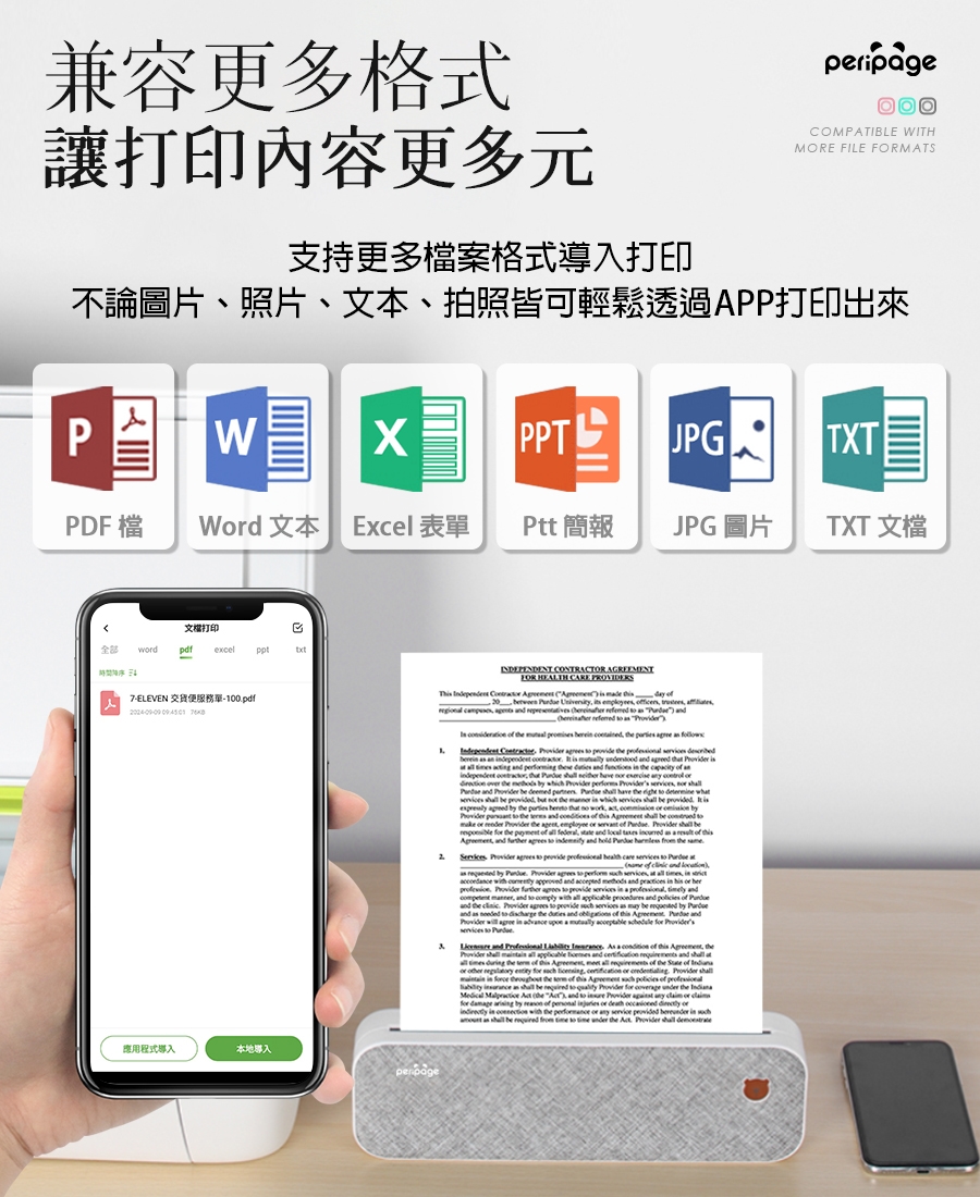 A:可以喔!兼容多樣格式,PDF檔案、Word文本、Excel表單、Ptt簡報、JPG圖片、TXT文檔案等...皆可導入APP輕鬆打印