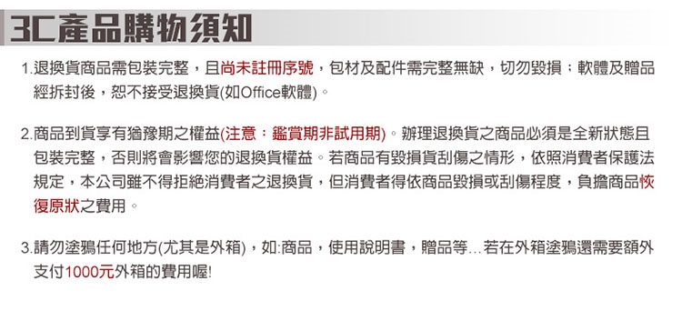★ 商品經連上網路,即自動註冊並開始計算商品保固時間,故不得申請退貨,若需退貨須收取額外費用
