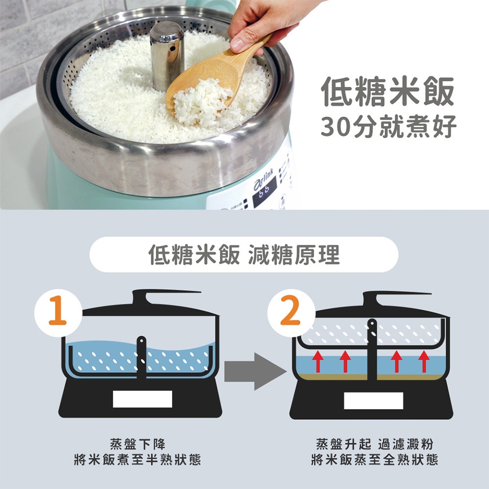● 低糖米飯快煮,米水分離降低澱粉糖份熱量