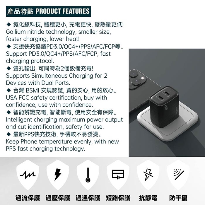 ◎ 使用「氮化鎵」科技,體積更小,充電快、發熱量低
