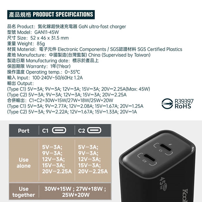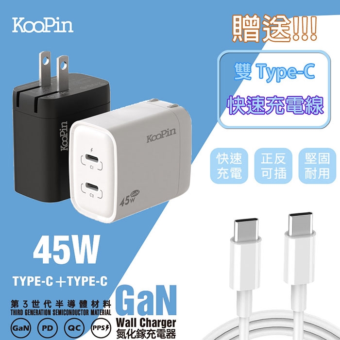 【KooPin】45W氮化鎵GaN 雙孔PD 極速充電器(附贈Type-C充電線)
