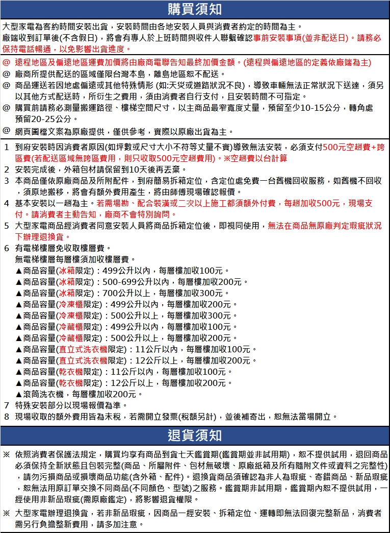 詳情請看購買須知、安裝須知、退貨須知說明圖。