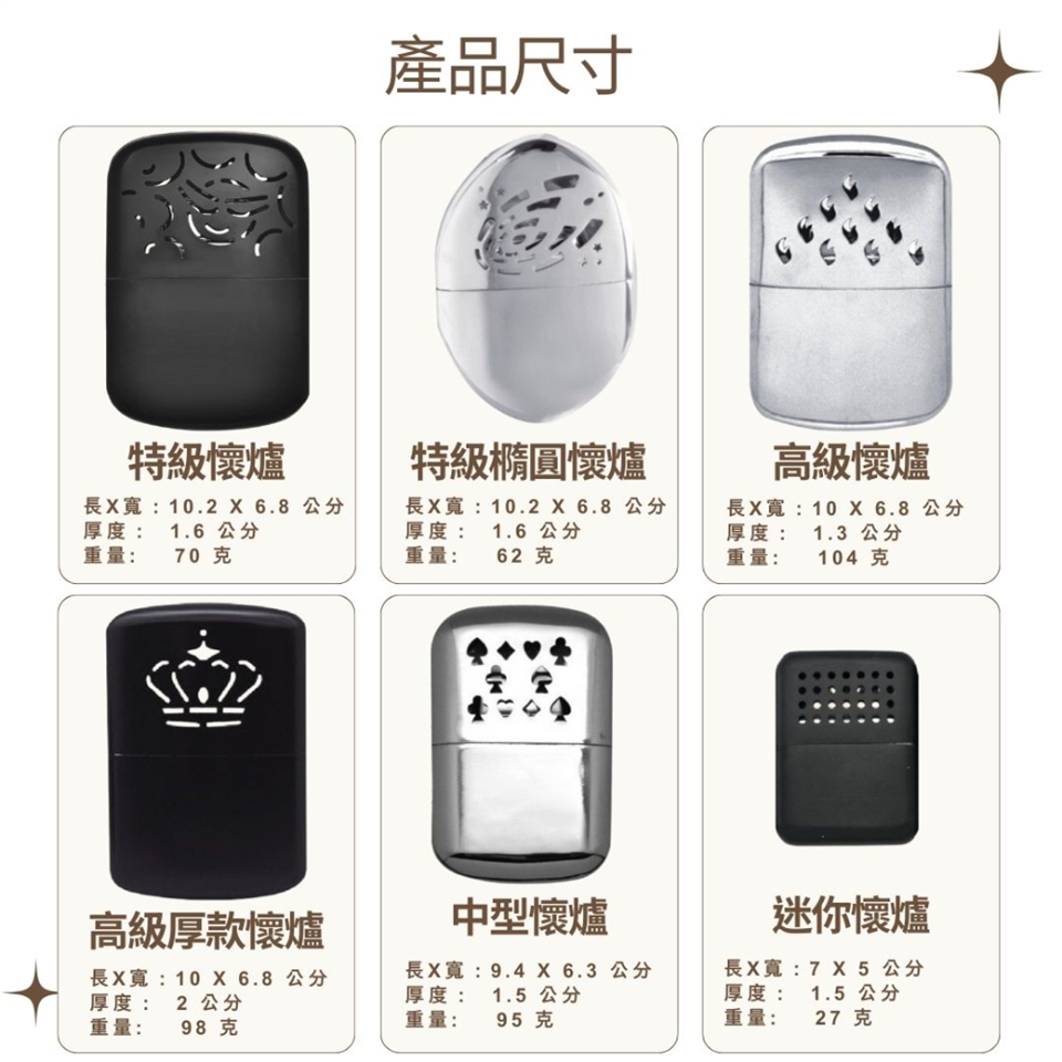 特級白金懷爐尺寸:長:10.2 cm 高:6.8 cm 寬:1.6 cm﹔重量: 70g