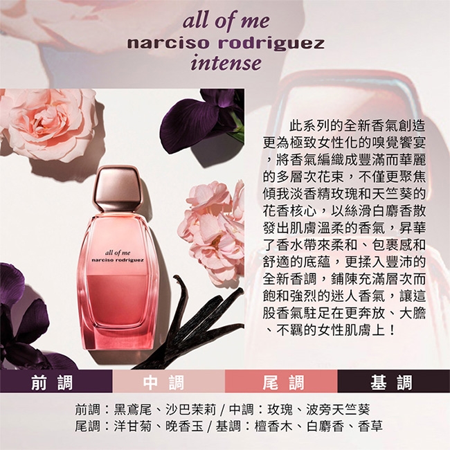all of me無畏淡香精馥郁版保留原系列對女性擁抱自我內在的讚頌,延續第一代傾我淡香精「玫瑰與天竺葵、麝香」靈魂香調,透過香味表達更多女性的外顯性格與寵愛自己的聲音,強而有力深入這一股極度迷人的全新氣息,和 Narciso Rodriguez 一起探索迷人又陶醉的嗅覺體驗。