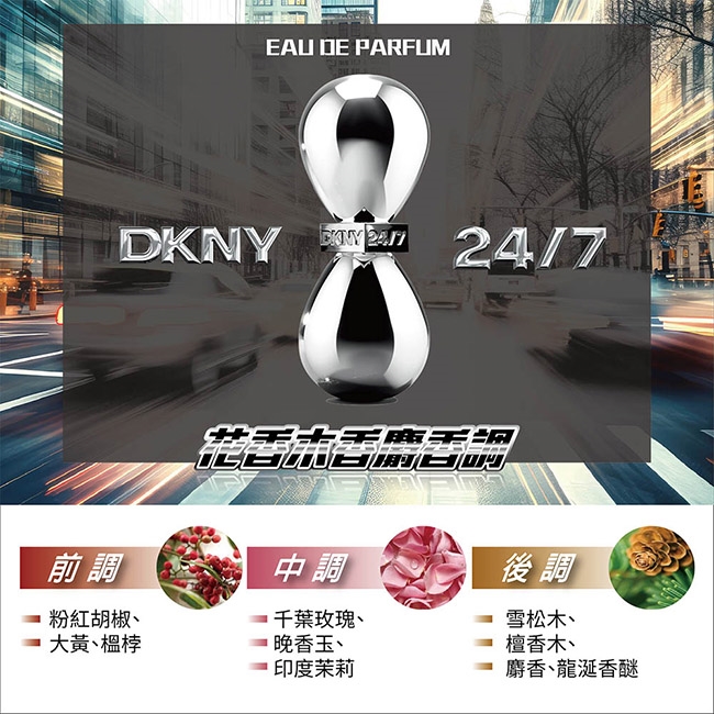 DKNY 24/7 時光之鑰女性淡香精向那些無限可能、隨時準備、永遠在行動中的人們致敬,就如同DKNY和紐約本身一樣,永不止息,隨時在線。