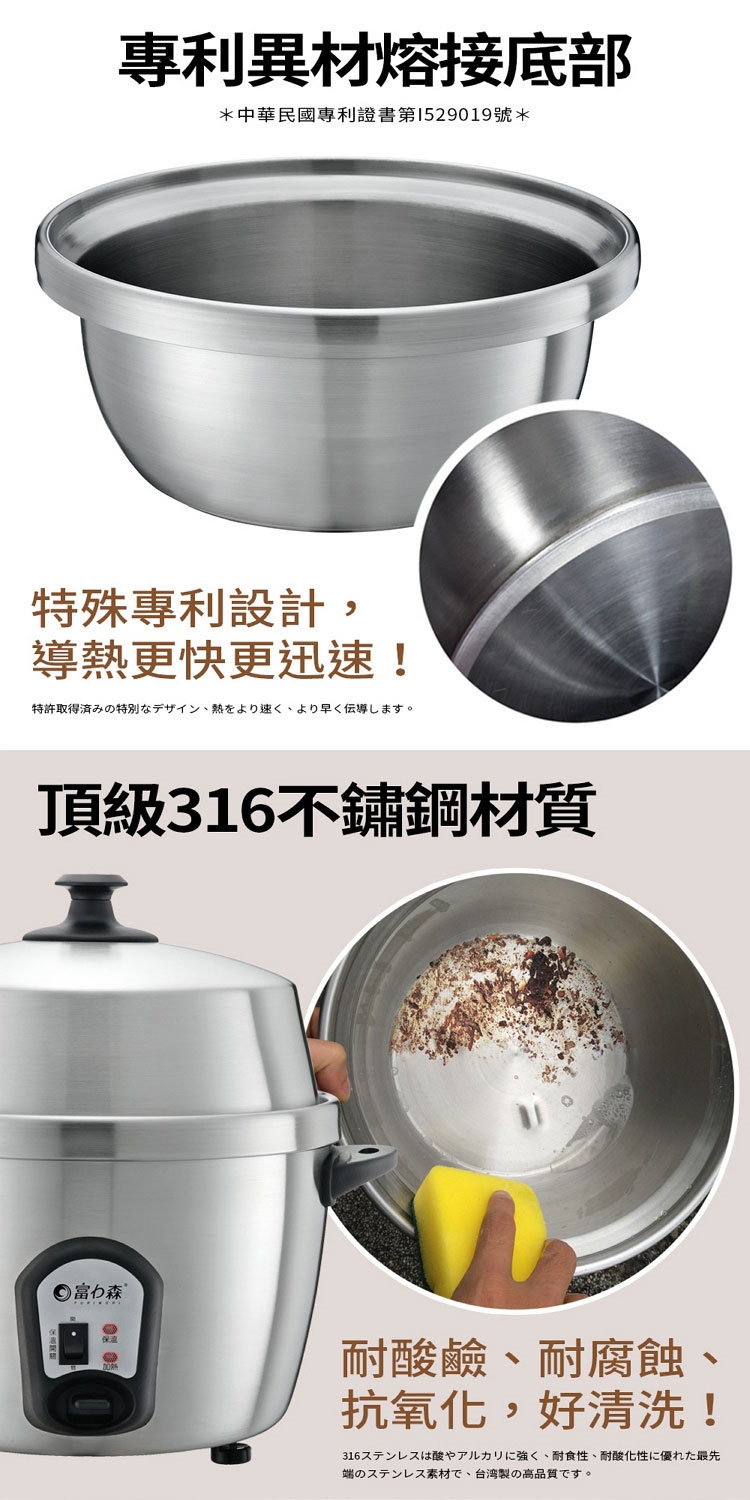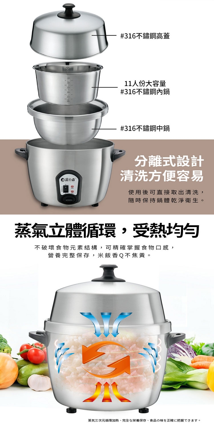 ◎ 材質:高蓋-#316不鏽鋼/中鍋-#316不鏽鋼/內鍋-#316不鏽鋼/外殼-430不鏽鋼/蒸架-304不鏽鋼/飯匙-食品級耐熱P.P./計量杯-食品級耐熱P.P.