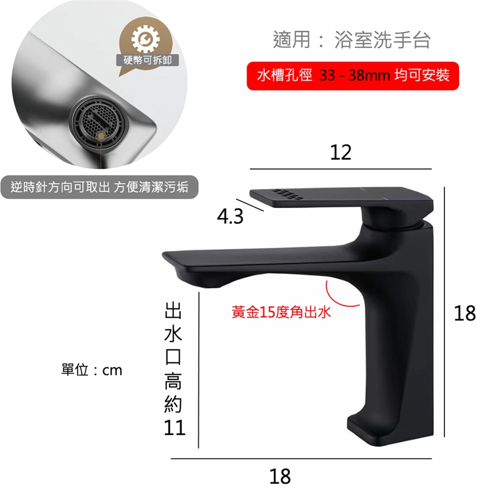開孔標準:面盆圓孔 3.3 - 3.8 公分的圓孔可安裝