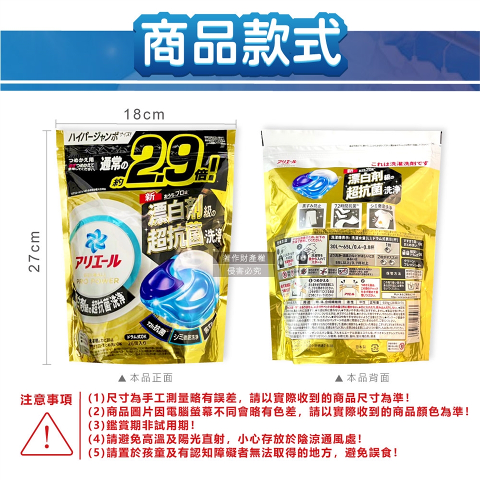 ●品名:Ariel PRO POWER酵素漂白去污強洗淨力洗衣凝膠球