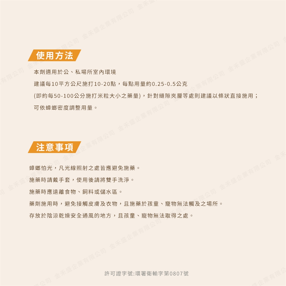 針對縫隙夾層等處則建議以條狀直接施用;可依蟑螂密度調整用量。