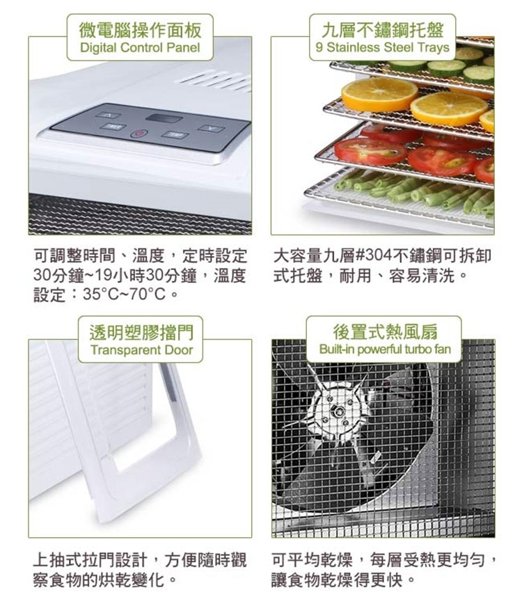 ◆ 透明塑膠擋門,方便觀察食物的烘乾變化