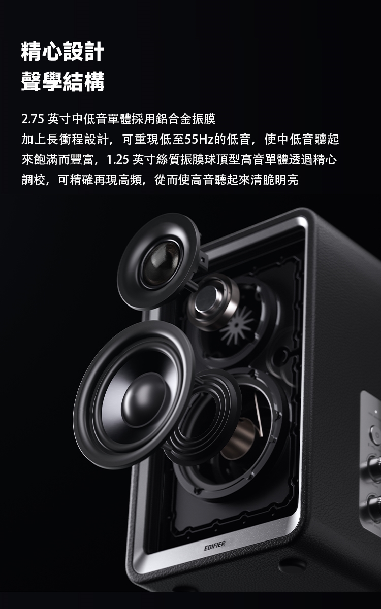 精準雙單體聲學配置|搭載 1.25 吋絲質高音單體與 2.75 吋中低音單體,音場定位清晰,人聲自然、低頻紮實不混濁。