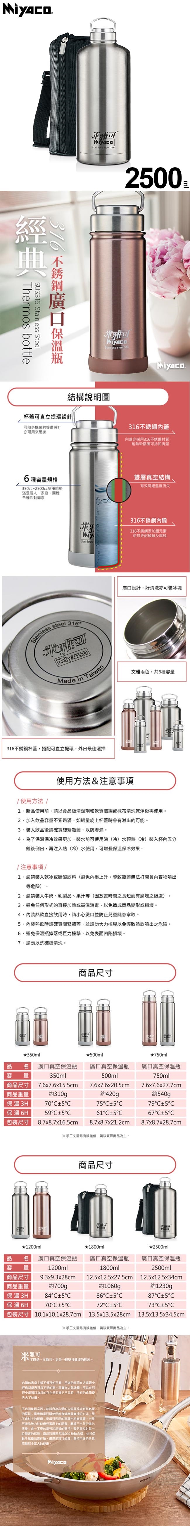 米雅可 經典316不鏽鋼廣口真空保溫瓶2.5L(不鏽鋼色)附揹袋 MY-F14250S 台灣製