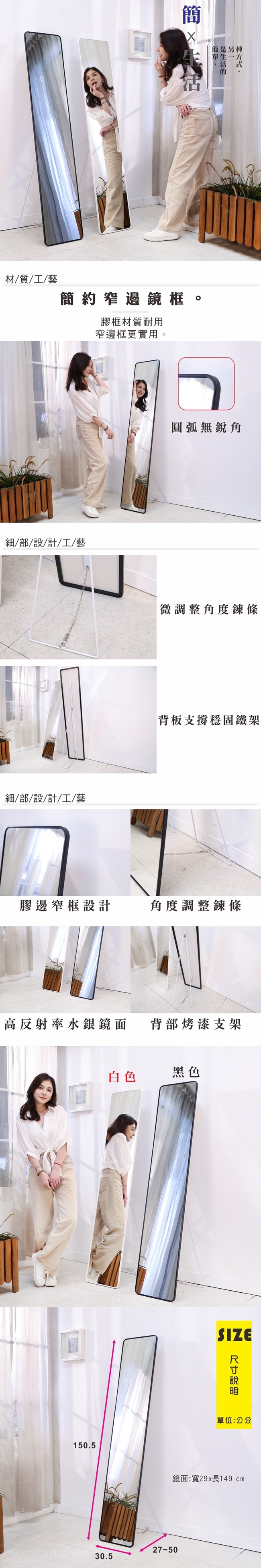 細緻的膠框設計,圓滑的邊角,呈現出極簡的無印風格。採用鍍銀玻璃鏡片,95%的反射率,比起市面上反射率82%的鍍鋁鏡片或是壓克力鏡更能呈現最真實的膚色及影像,不會照起來忽大忽小,在實用性上已經幫您考慮了! 直立式的擺設,不會佔用你太大的空間,擺在臥房、玄關…都很適合,鏡面傾斜角度,可隨鐵鍊長短做調整。具時尚感,耐看且有質感,不加任何的贅飾,更顯簡潔大方。