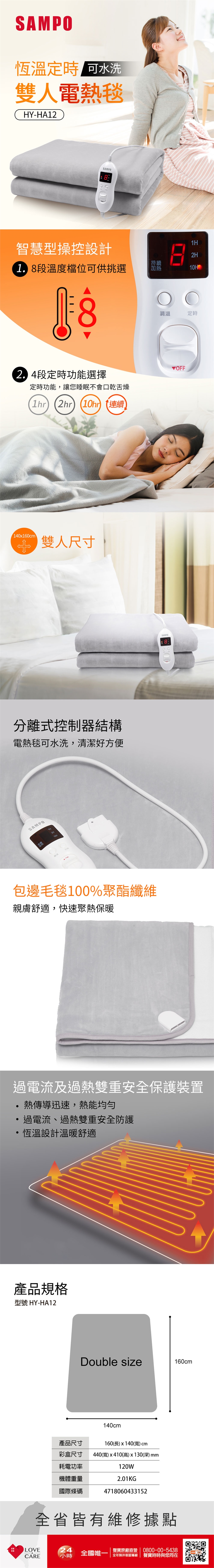 SAMPO聲寶 恆溫定時雙人電熱毯 HY-HA12