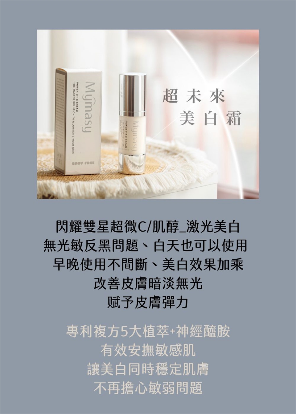 超未來美白霜:按壓兩下於掌心均勻抹開後,輕抹在雙頰、額頭、下巴的順序,輕輕按摩至吸收。對於想要加強美白的部分,可以額外使用約小指指甲大小的量厚敷,每天晚上使用,達到最佳美白效果。