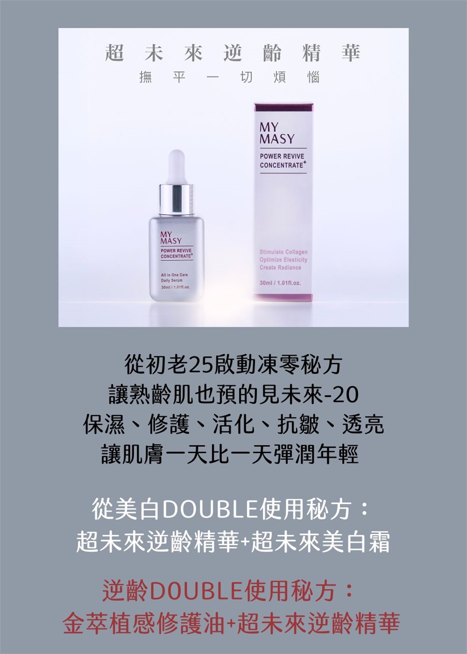 超未來逆齡精華:取精華液約10元硬幣大小於掌心,輕抹於全臉並按摩至吸收即可。