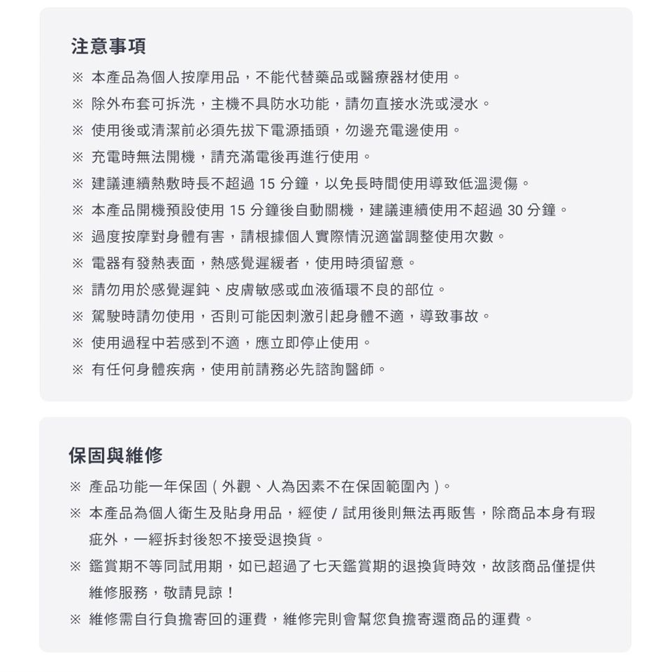 01. 本產品為個人按摩用品,不能代替藥品或醫療器材使用。