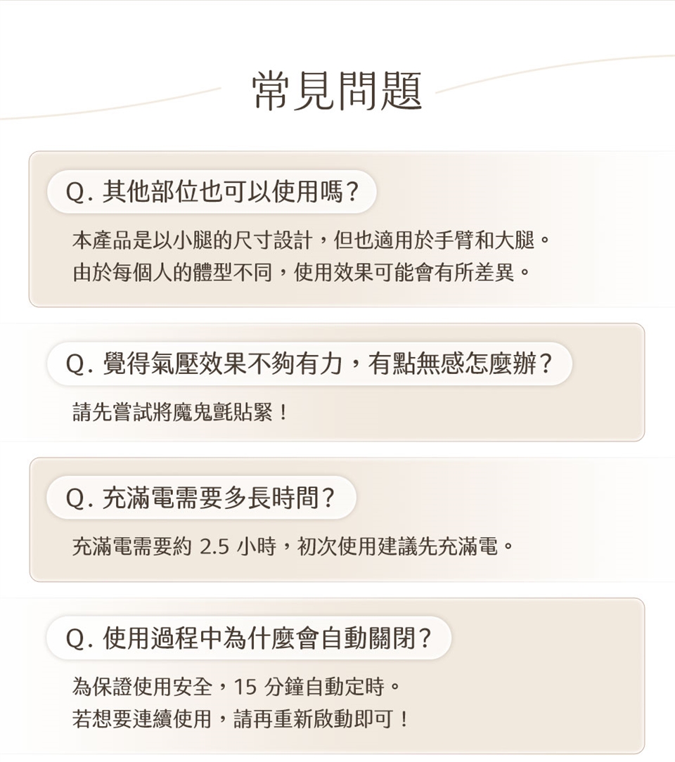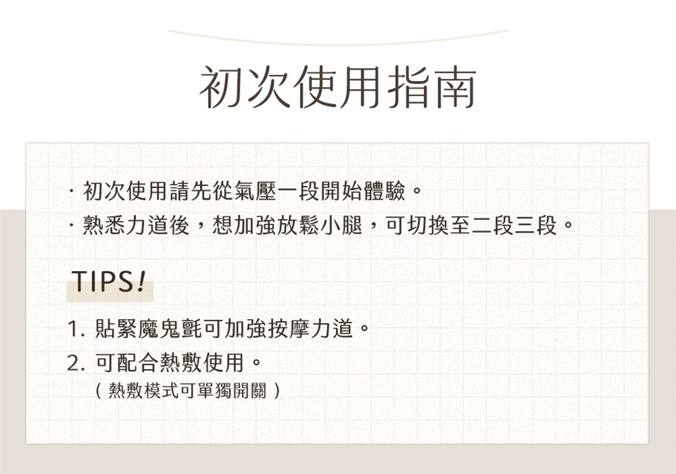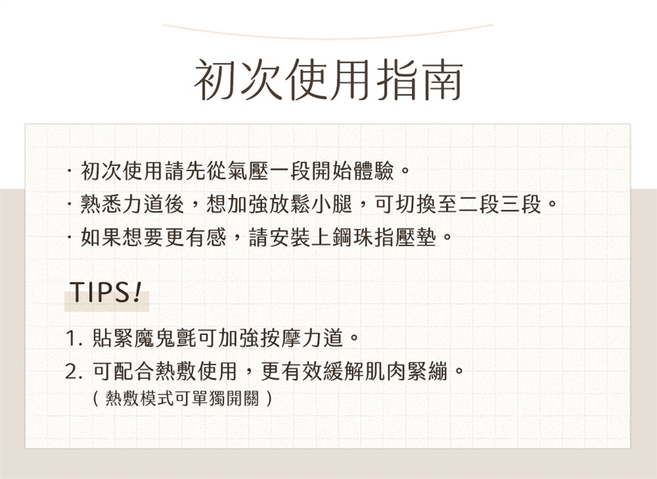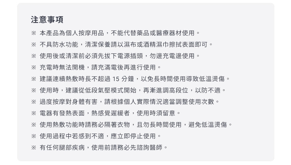1. 本產品為個人按摩用品,不能代替藥品或醫療器材使用。